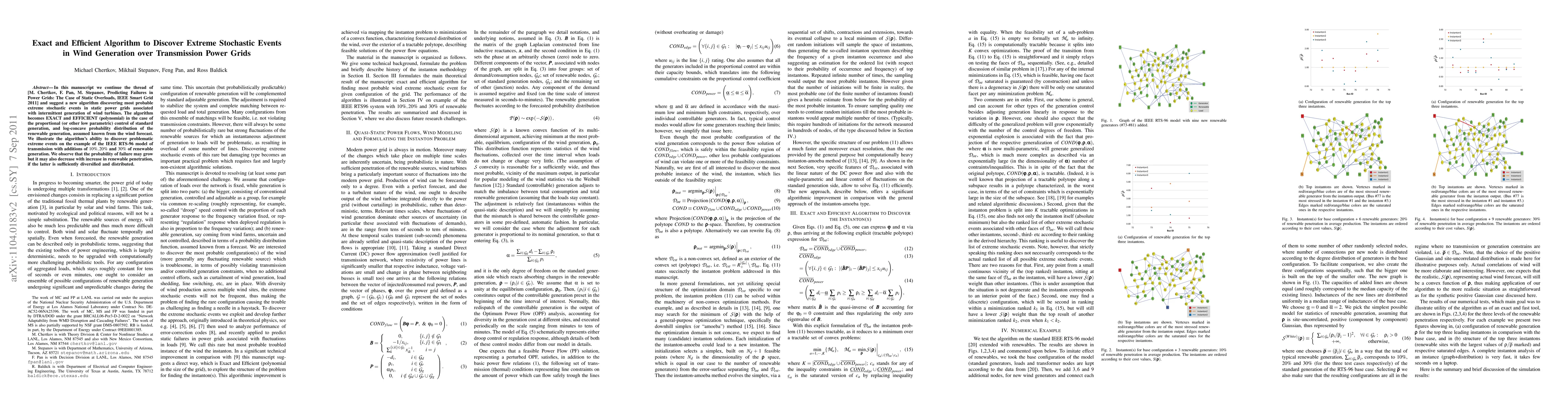 In this manuscript we continue the thread of [M. Chertkov, F. Pan, M. Stepanov, Predicting Failures in Power Grids: The Case of Static Overloads, IEEE Smart Grid 2011] and suggest a new algorithm discovering most probable extreme stochastic events in static power grids associated with intermittent generation of wind turbines. The algorithm becomes EXACT and EFFICIENT (polynomial) in the case of the proportional (or other low parametric) control of standard generation, and log-concave probability distribution of the renewable generation, assumed known from the wind forecast. We illustrate the algorithm's ability to discover problematic extreme events on the example of the IEEE RTS-96 model of transmission with additions of 10%, 20% and 30% of renewable generation. We observe that the probability of failure may grow but it may also decrease with increase in renewable penetration, if the latter is sufficiently diversified and distributed.