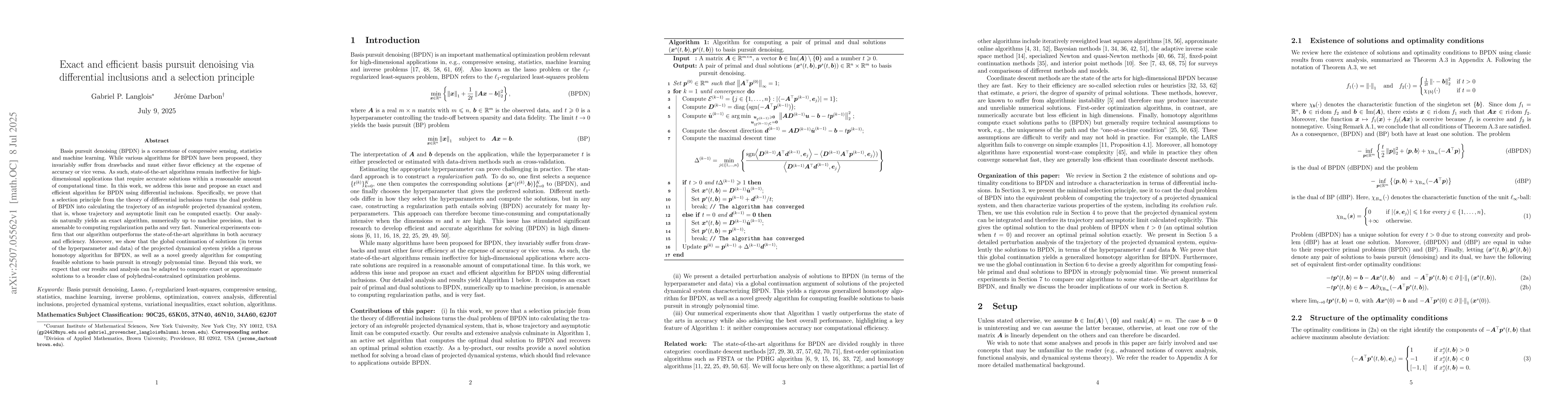 Basis pursuit denoising (BPDN) is a cornerstone of compressive sensing, statistics and machine learning. While various algorithms for BPDN have been proposed, they invariably suffer from drawbacks and must either favor efficiency at the expense of accuracy or vice versa. As such, state-of-the-art algorithms remain ineffective for high-dimensional applications that require accurate solutions within a reasonable amount of computational time. In this work, we address this issue and propose an exact and efficient algorithm for BPDN using differential inclusions. Specifically, we prove that a selection principle from the theory of differential inclusions turns the dual problem of BPDN into calculating the trajectory of an \emph{integrable} projected dynamical system, that is, whose trajectory and asymptotic limit can be computed exactly. Our analysis naturally yields an exact algorithm, numerically up to machine precision, that is amenable to computing regularization paths and very fast. Numerical experiments confirm that our algorithm outperforms the state-of-the-art algorithms in both accuracy and efficiency. Moreover, we show that the global continuation of solutions (in terms of the hyperparameter and data) of the projected dynamical system yields a rigorous homotopy algorithm for BPDN, as well as a novel greedy algorithm for computing feasible solutions to basis pursuit in strongly polynomial time. Beyond this work, we expect that our results and analysis can be adapted to compute exact or approximate solutions to a broader class of polyhedral-constrained optimization problems.