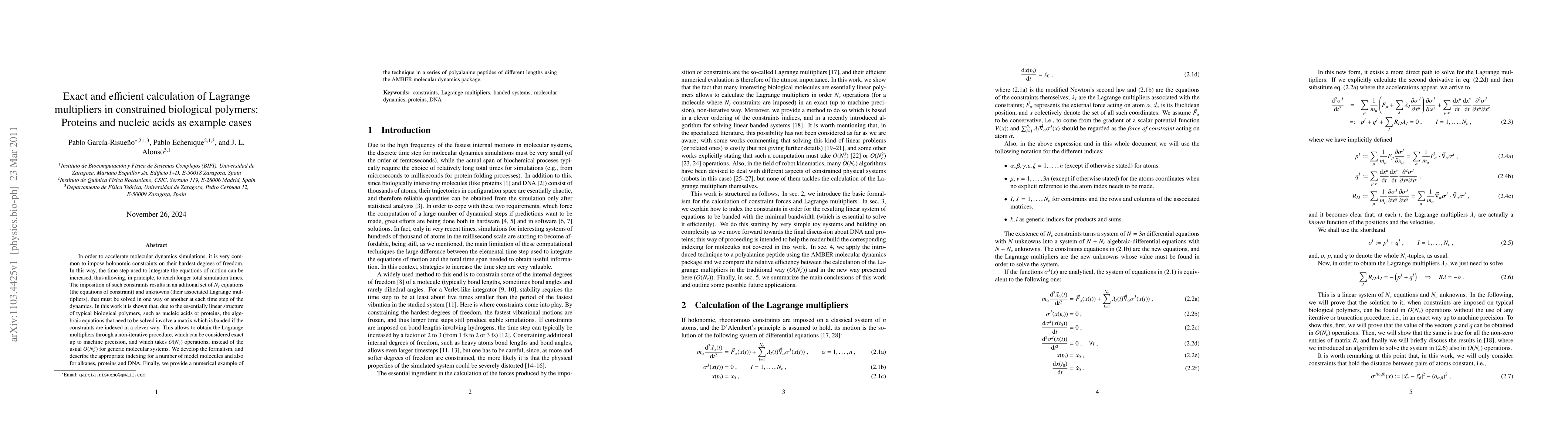 This paper presents an efficient method for calculating Lagrange multipliers in constrained biological polymers, reducing computational complexity from O(Nc³) to O(Nc), thus accelerating molecular dynamics simulations. The method leverages the linear structure of polymers to solve constraint equations non-iteratively and is demonstrated on proteins, nucleic acids, and alkanes.