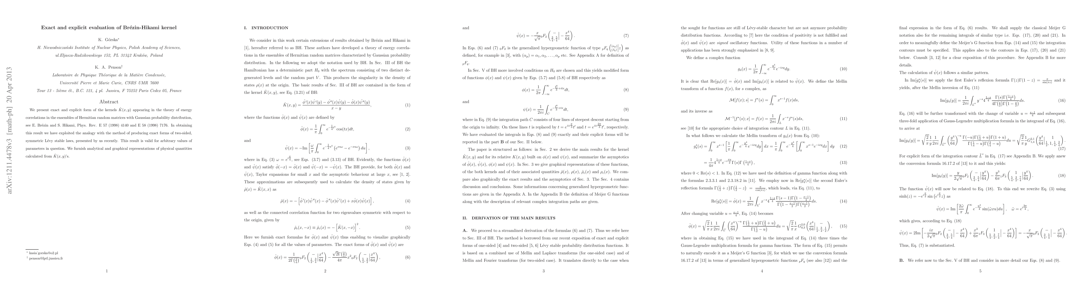 This paper provides the exact and explicit form of the Brezin-Hikami kernels, which describe energy correlations in Gaussian ensembles of Hermitian random matrices. The authors derive these results by drawing parallels with the method used for obtaining exact forms of two-sided, symmetric Lévy stable laws.