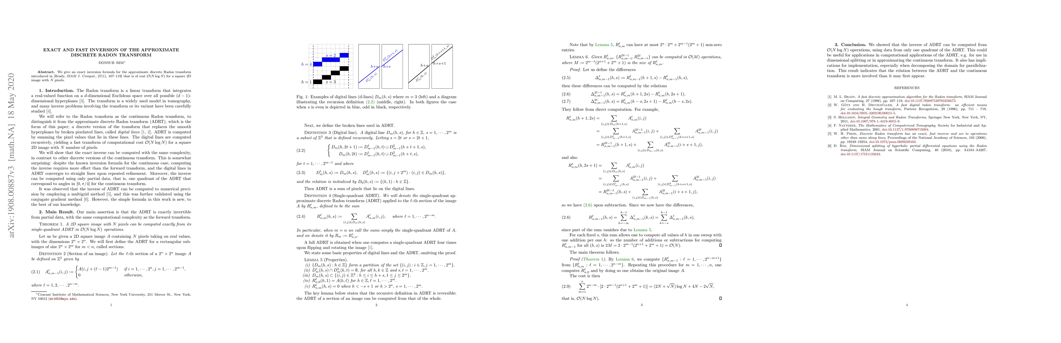 This research presents an exact formula to reverse the approximate discrete Radon transform, a method used in image processing, with a computational cost of O(N log N) for square 2D images with N pixels. The method requires only partial data, which is a significant improvement in efficiency and applicability.