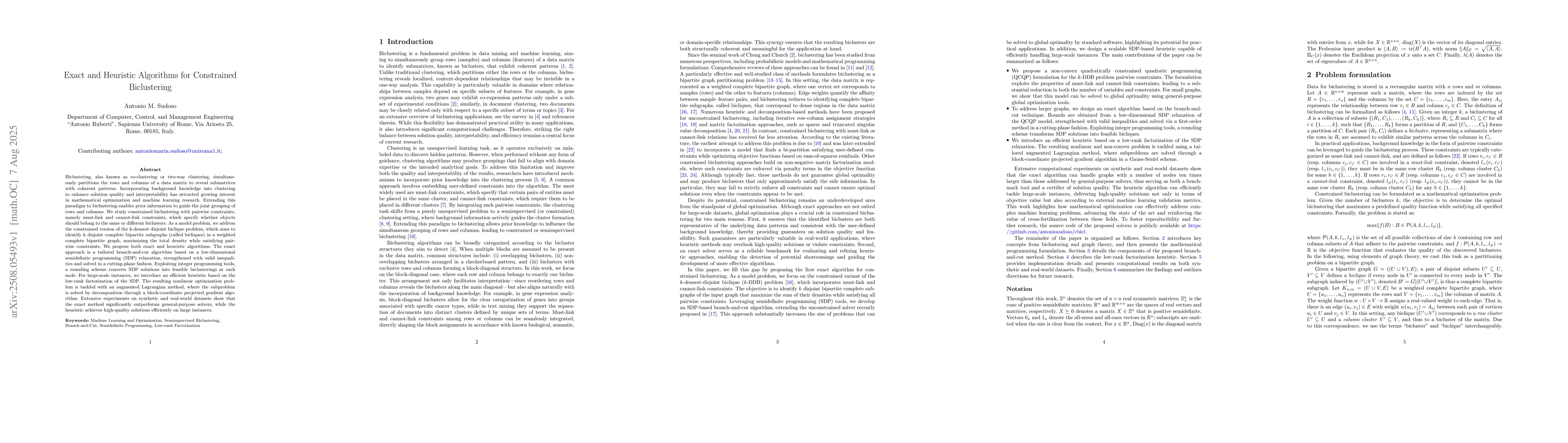 Biclustering, also known as co-clustering or two-way clustering, simultaneously partitions the rows and columns of a data matrix to reveal submatrices with coherent patterns. Incorporating background knowledge into clustering to enhance solution quality and interpretability has attracted growing interest in mathematical optimization and machine learning research. Extending this paradigm to biclustering enables prior information to guide the joint grouping of rows and columns. We study constrained biclustering with pairwise constraints, namely must-link and cannot-link constraints, which specify whether objects should belong to the same or different biclusters. As a model problem, we address the constrained version of the k-densest disjoint biclique problem, which aims to identify k disjoint complete bipartite subgraphs (called bicliques) in a weighted complete bipartite graph, maximizing the total density while satisfying pairwise constraints. We propose both exact and heuristic algorithms. The exact approach is a tailored branch-and-cut algorithm based on a low-dimensional semidefinite programming (SDP) relaxation, strengthened with valid inequalities and solved in a cutting-plane fashion. Exploiting integer programming tools, a rounding scheme converts SDP solutions into feasible biclusterings at each node. For large-scale instances, we introduce an efficient heuristic based on the low-rank factorization of the SDP. The resulting nonlinear optimization problem is tackled with an augmented Lagrangian method, where the subproblem is solved by decomposition through a block-coordinate projected gradient algorithm. Extensive experiments on synthetic and real-world datasets show that the exact method significantly outperforms general-purpose solvers, while the heuristic achieves high-quality solutions efficiently on large instances.