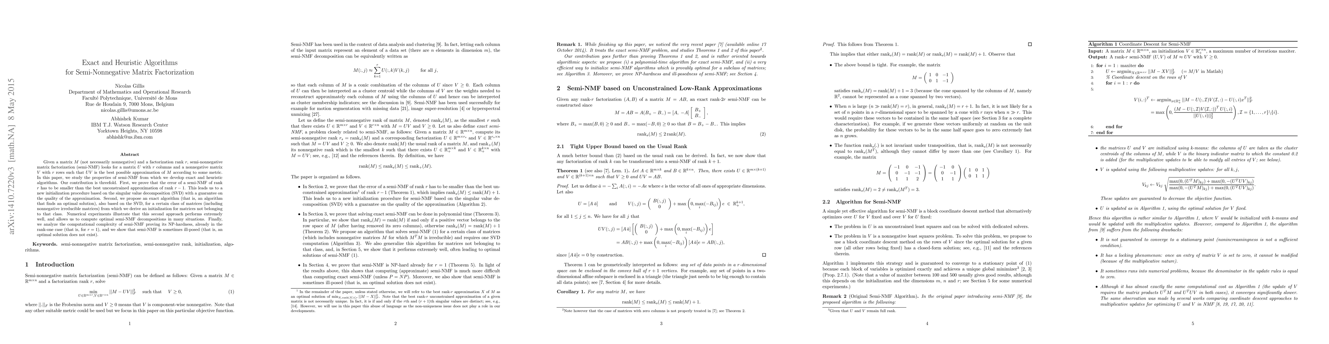 This paper develops exact and heuristic algorithms for semi-nonnegative matrix factorization (semi-NMF), proving that semi-NMF error must be better than the best rank $r-1$ unconstrained approximation. It introduces an optimal exact algorithm based on SVD for certain matrix classes and presents a heuristic approach for others, demonstrating its efficiency through numerical experiments.