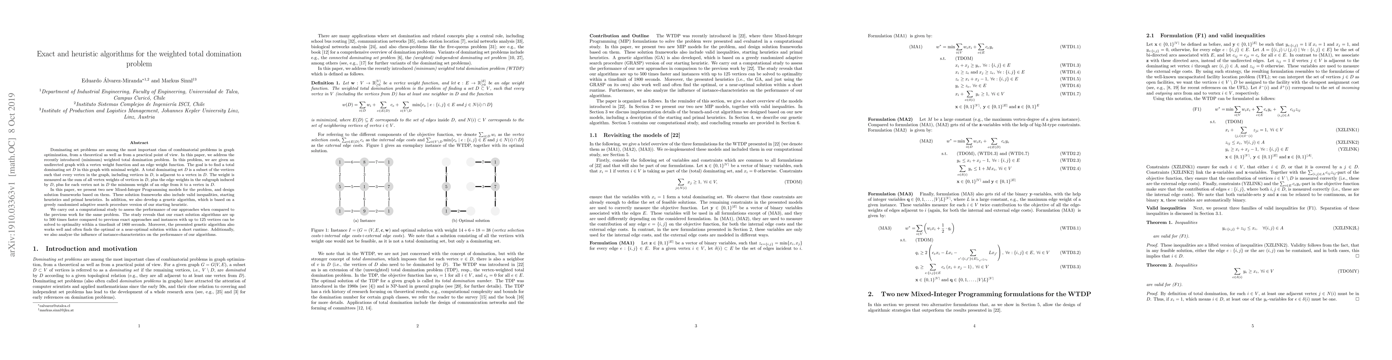 Dominating set problems are among the most important class of combinatorial problems in graph optimization, from a theoretical as well as from a practical point of view. In this paper, we address the recently introduced (minimum) weighted total domination problem. In this problem, we are given an undirected graph with a vertex weight function and an edge weight function. The goal is to find a total dominating set D in this graph with minimal weight. A total dominating set D is a subset of the vertices such that every vertex in the graph, including vertices in D, is adjacent to a vertex in D. The weight is measured as the sum of all vertex weights of vertices in D, plus the edge weights in the subgraph induced by D, plus for each vertex not in D the minimum weight of an edge from it to a vertex in D. In this paper, we present two new Mixed-Integer Programming models for the problem, and design solution frameworks based on them. These solution frameworks also include valid inequalities, starting heuristics and primal heuristics. In addition, we also develop a genetic algorithm, which is based on a greedy randomized adaptive search procedure version of our starting heuristic. We carry out a computational study to assess the performance of our approaches when compared to the previous work for the same problem. The study reveals that our exact solution algorithms are up to 500 times faster compared to previous exact approaches and instances with up to 125 vertices can be solved to optimality within a timelimit of 1800 seconds. Moreover, the presented genetic algorithm also works well and often finds the optimal or a near-optimal solution within a short runtime. Additionally, we also analyze the influence of instance-characteristics on the performance of our algorithms.