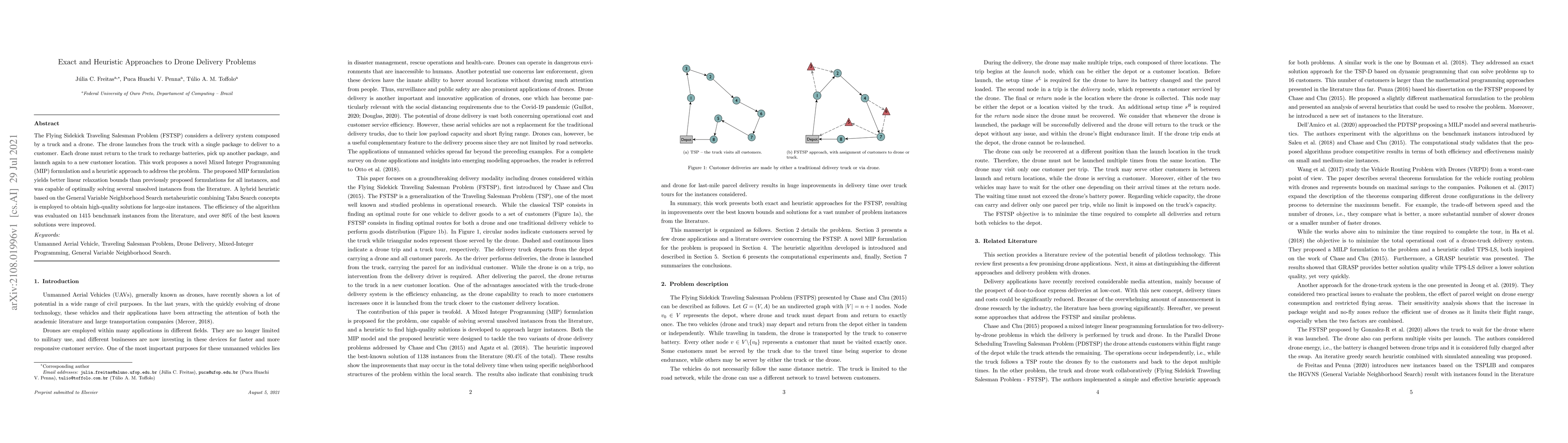 The Flying Sidekick Traveling Salesman Problem (FSTSP) considers a delivery system composed by a truck and a drone. The drone launches from the truck with a single package to deliver to a customer. Each drone must return to the truck to recharge batteries, pick up another package, and launch again to a new customer location. This work proposes a novel Mixed Integer Programming (MIP) formulation and a heuristic approach to address the problem. The proposedMIP formulation yields better linear relaxation bounds than previously proposed formulations for all instances, and was capable of optimally solving several unsolved instances from the literature. A hybrid heuristic based on the General Variable Neighborhood Search metaheuristic combining Tabu Search concepts is employed to obtain high-quality solutions for large-size instances. The efficiency of the algorithm was evaluated on 1415 benchmark instances from the literature, and over 80% of the best known solutions were improved.