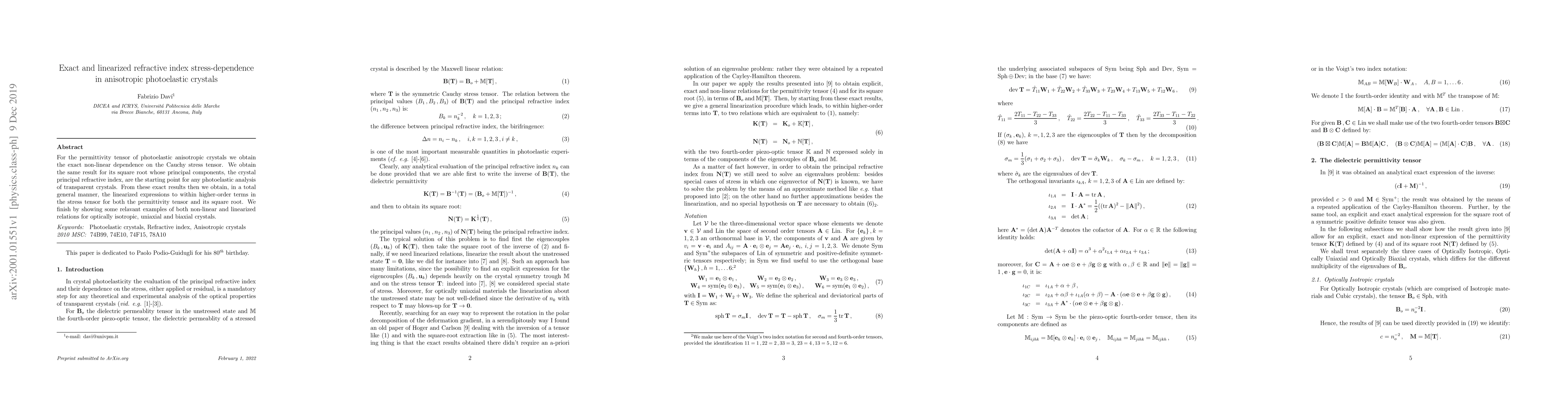 For the permittivity tensor of photoelastic anisotropic crystals we obtain the exact non-linear dependence on the Cauchy stress tensor. We obtain the same result for its square root whose principal components, the crystal principal refractive index, are the starting point for any photoelastic analysis of transparent crystals. From these exact results then we obtain, in a total general manner, the linearized expressions to within higher-order terms in the stress tensor for both the permittivity tensor and its square root. We finish by showing some relavant examples of both non-linear and linearized relations for optically isotropic, uniaxial and biaxial crystals.