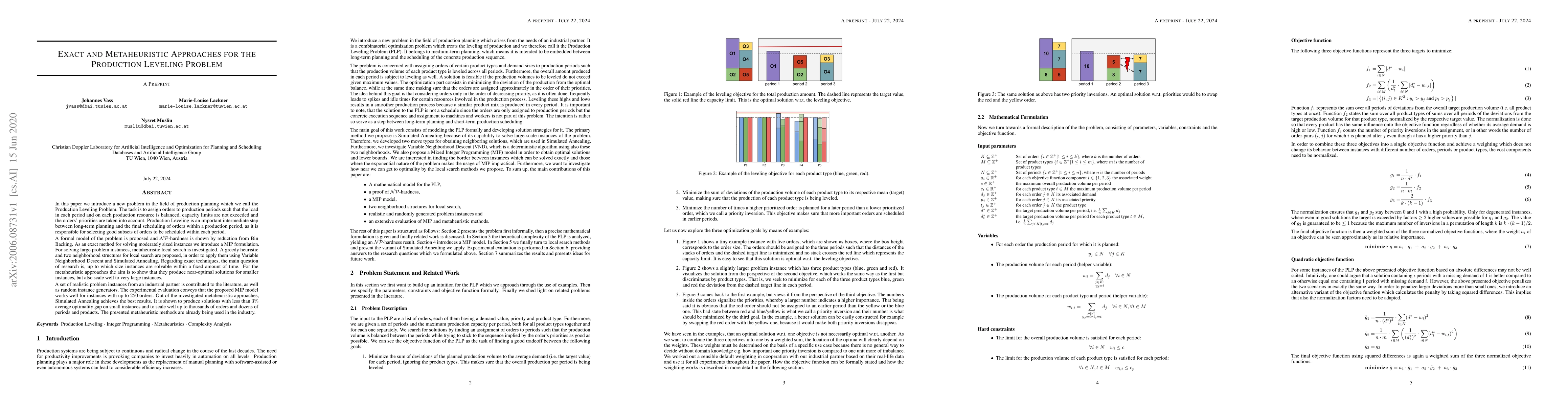This paper introduces the Production Leveling Problem in production planning, aiming to balance load across production periods while respecting capacity limits and order priorities. An exact MIP formulation is proposed for moderate-sized problems, while metaheuristic methods like Simulated Annealing are used for larger instances, achieving near-optimal results and scalability.