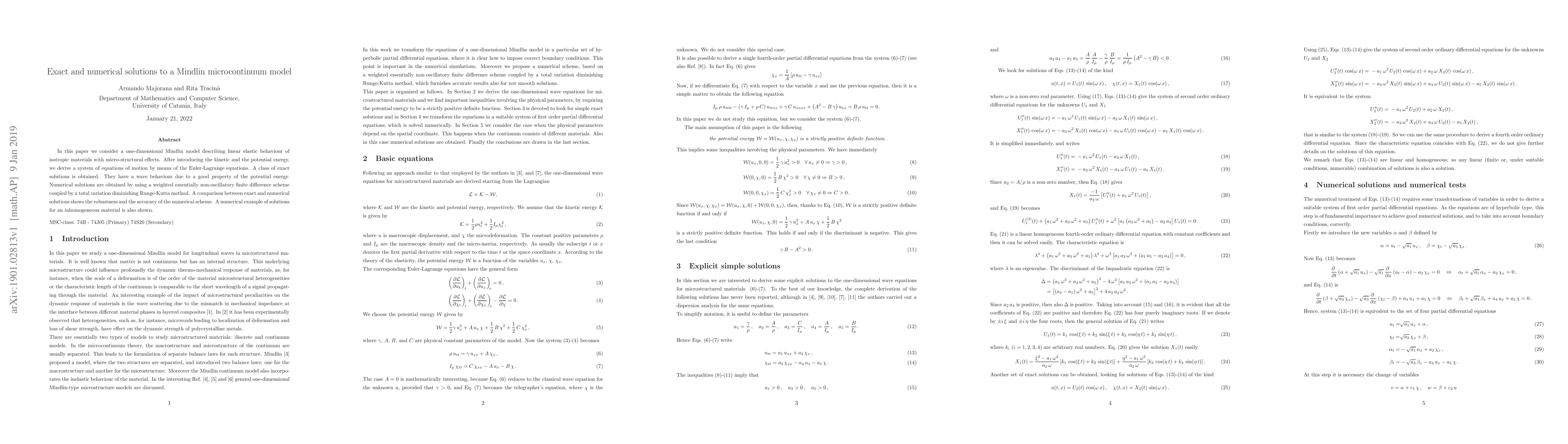 In this paper we consider a one-dimensional Mindlin model describing linear elastic behaviour of isotropic materials with micro-structural effects. After introducing the kinetic and the potential energy, we derive a system of equations of motion by means of the Euler-Lagrange equations. A class of exact solutions is obtained. They have a wave behaviour due to a good property of the potential energy. Numerical solutions are obtained by using a weighted essentially non-oscillatory finite difference scheme coupled by a total variation diminishing Runge-Kutta method. A comparison between exact and numerical solutions shows the robustness and the accuracy of the numerical scheme. A numerical example of solutions for an inhomogeneous material is also shown.