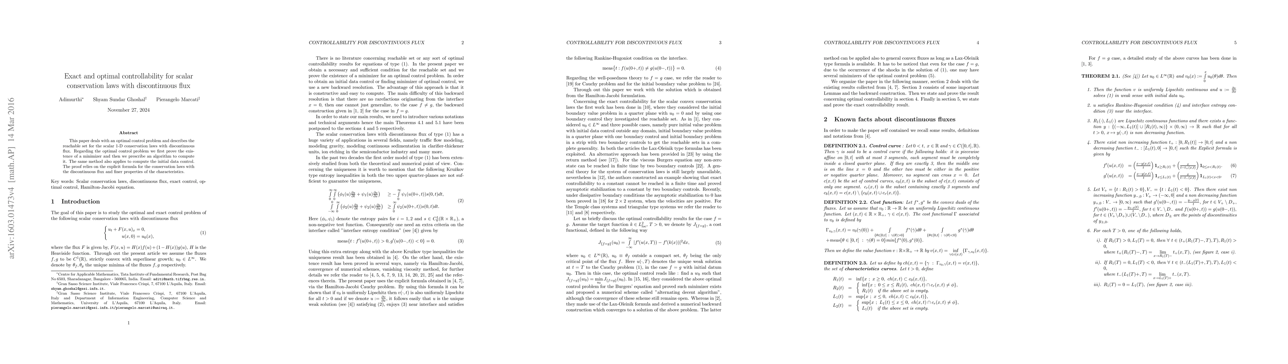 This paper investigates optimal control for scalar 1-D conservation laws with discontinuous flux, proving the existence of a minimizer and presenting an algorithm to compute it. The method also extends to determine initial data control, leveraging the explicit formula and characteristic properties.