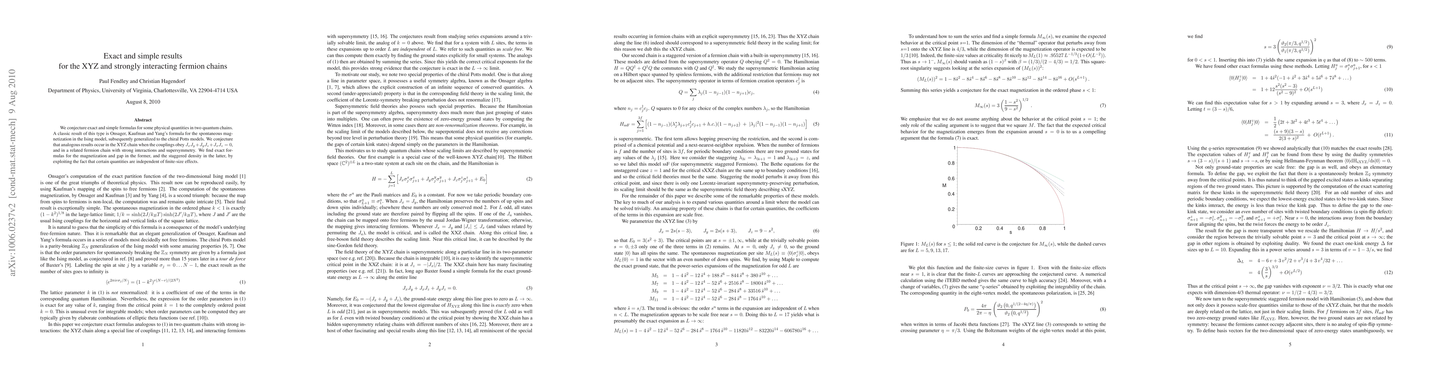 We conjecture exact and simple formulas for physical quantities in two quantum chains. A classic result of this type is Onsager, Kaufman and Yang's formula for the spontaneous magnetization in the Ising model, subsequently generalized to the chiral Potts models. We conjecture that analogous results occur in the XYZ chain when the couplings obey J_xJ_y + J_yJ_z + J_x J_z=0, and in a related fermion chain with strong interactions and supersymmetry. We find exact formulas for the magnetization and gap in the former, and the staggered density in the latter, by exploiting the fact that certain quantities are independent of finite-size effects.