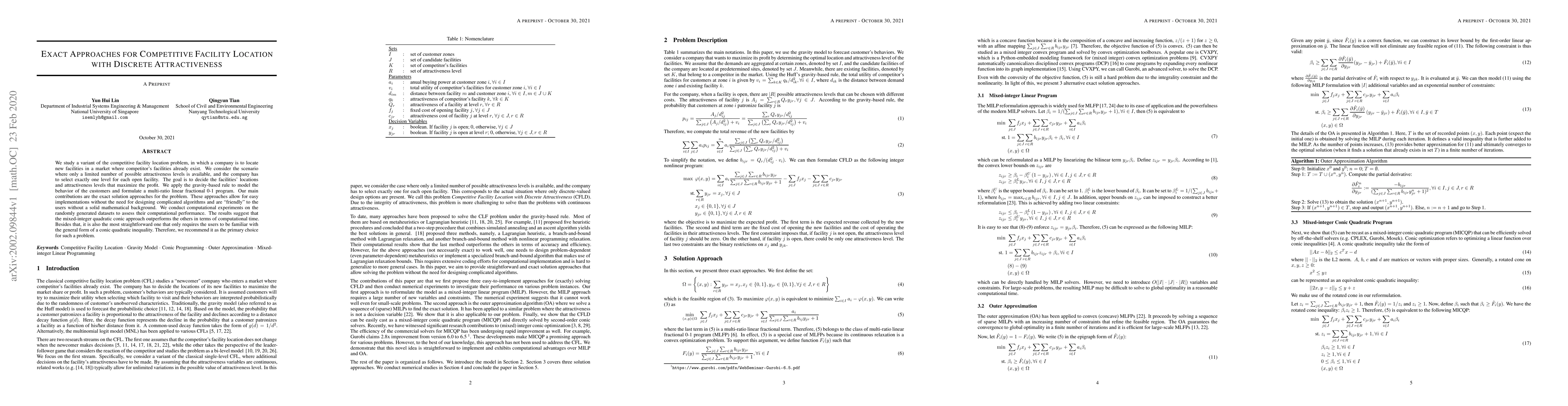 Researchers developed exact solutions for a competitive facility location problem with limited attractiveness levels, finding that a mixed-integer quadratic conic approach outperforms others in terms of computational time.