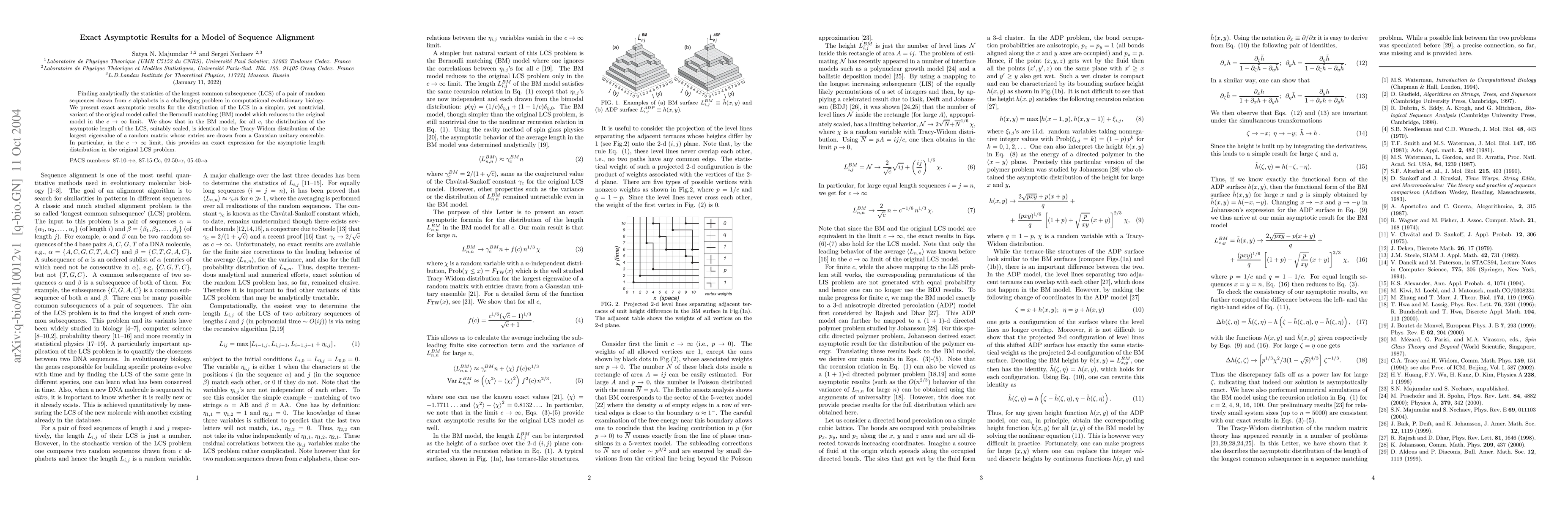 This research provides exact asymptotic results for the distribution of the longest common subsequence (LCS) in a simplified model called Bernoulli matching (BM). It shows that the scaled LCS length distribution in BM matches the Tracy-Widom distribution for large Gaussian unitary ensemble random matrices, offering an exact solution for the original LCS problem as the alphabet size increases.