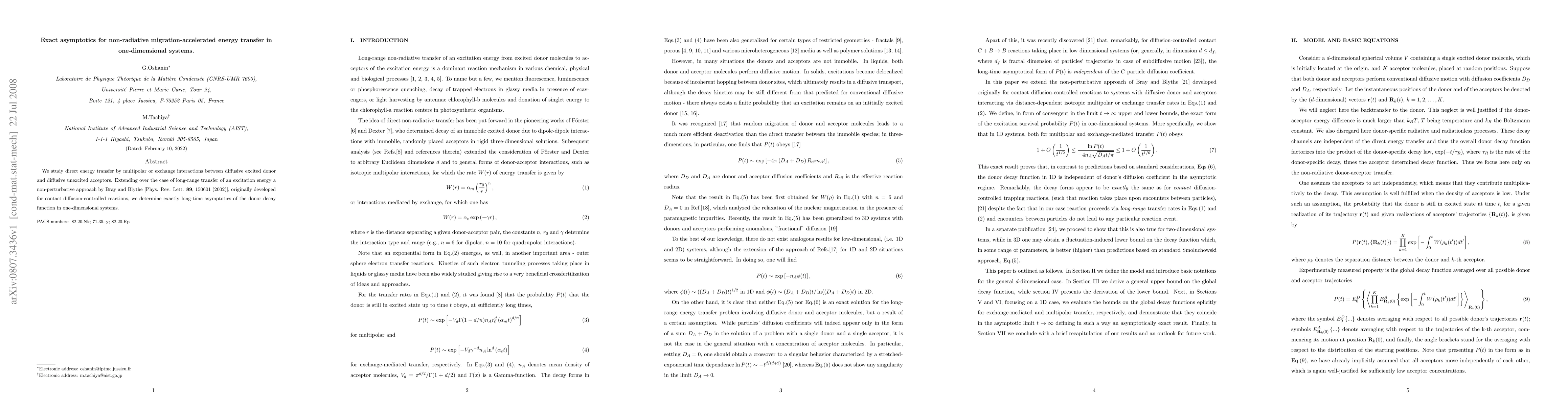 This paper explores the exact asymptotic behavior of energy transfer in one-dimensional systems via multipolar or exchange interactions between diffusive excited donors and unexcited acceptors, extending a non-perturbative approach to long-range energy transfer. It determines the long-time asymptotic behavior of the donor decay function.