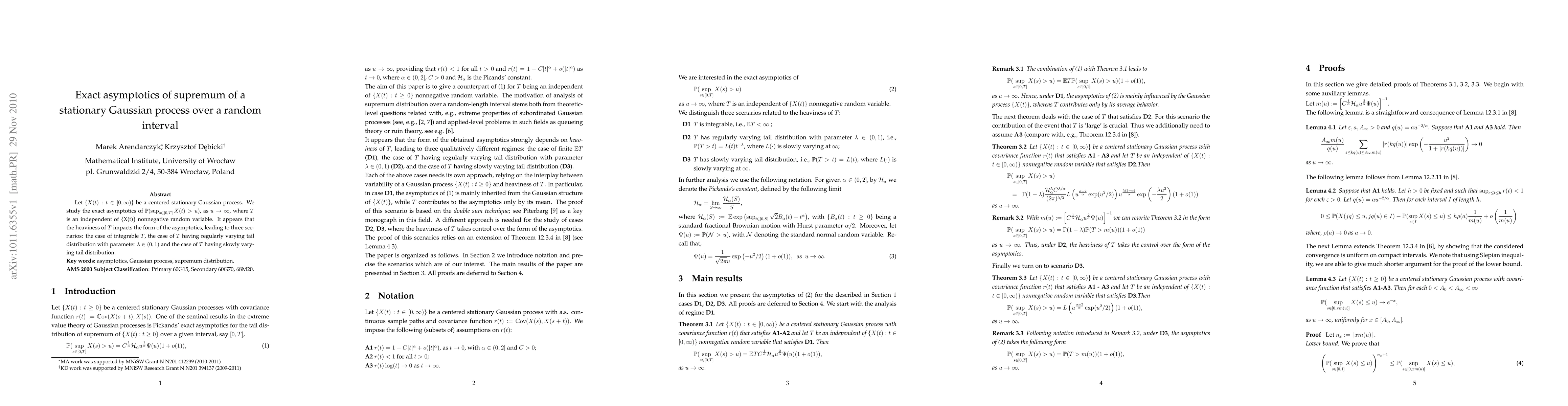 Let $\{X(t) : t \in [0, \infty) \}$ be a centered stationary Gaussian process. We study the exact asymptotics of $\pr (\sup_{s \in [0,T]} X(t) > u)$, as $u \to \infty$, where $T$ is an independent of \{X(t)\} nonnegative random variable. It appears that the heaviness of $T$ impacts the form of the asymptotics, leading to three scenarios: the case of integrable $T$, the case of $T$ having regularly varying tail distribution with parameter $\lambda\in(0,1)$ and the case of $T$ having slowly varying tail distribution.