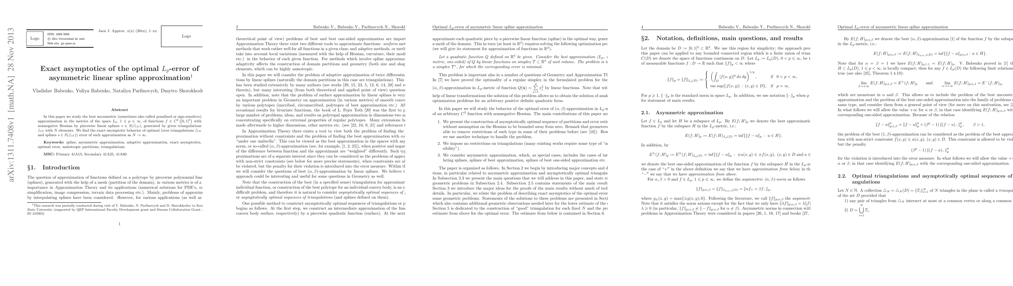 This paper investigates the best asymmetric linear spline approximation in $L_p$ spaces for functions with nonnegative Hessians, finding the exact asymptotic behavior of the optimal error as the number of triangulation elements approaches infinity.