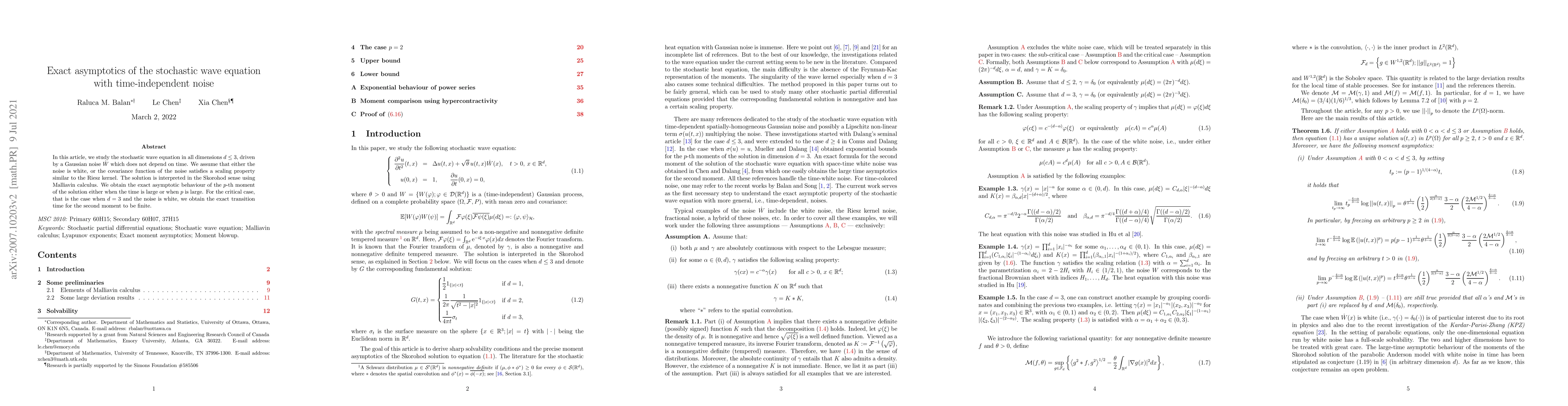 This paper investigates the stochastic wave equation in dimensions up to $d=3$ driven by time-independent Gaussian noise, deriving exact asymptotics for the $p$-th moment of the solution. The study employs Skorohod interpretation and Malliavin calculus, revealing precise transition times for finiteness in moments, especially for the critical $d=3$ white noise case.