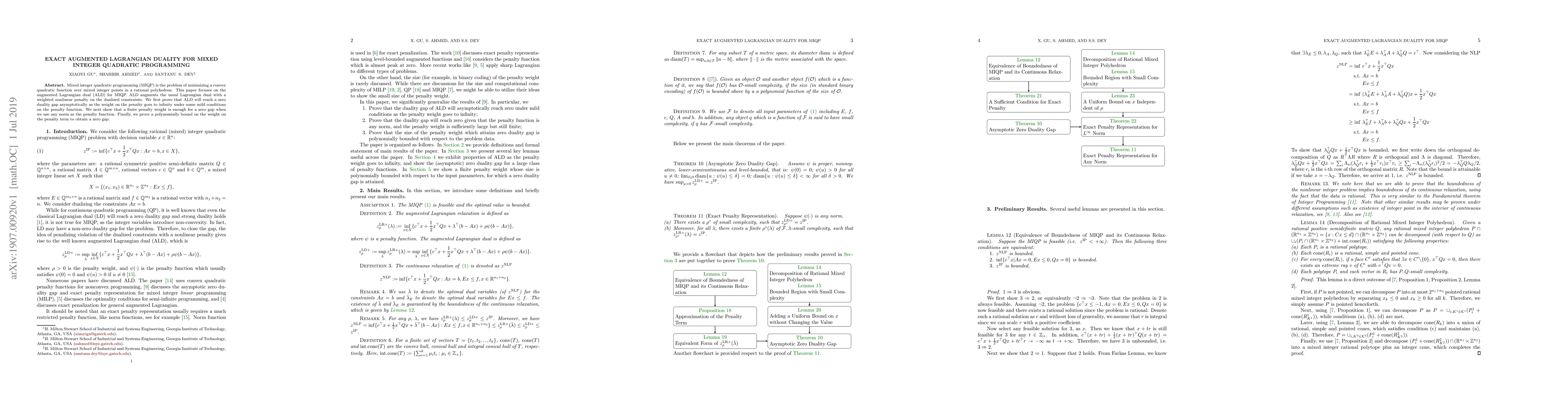 This paper develops an augmented Lagrangian dual (ALD) approach for mixed integer quadratic programming (MIQP), proving that ALD can asymptotically achieve a zero duality gap under certain conditions. It also demonstrates that a finite penalty weight can suffice for a zero gap, along with a polynomial bound on the penalty term.