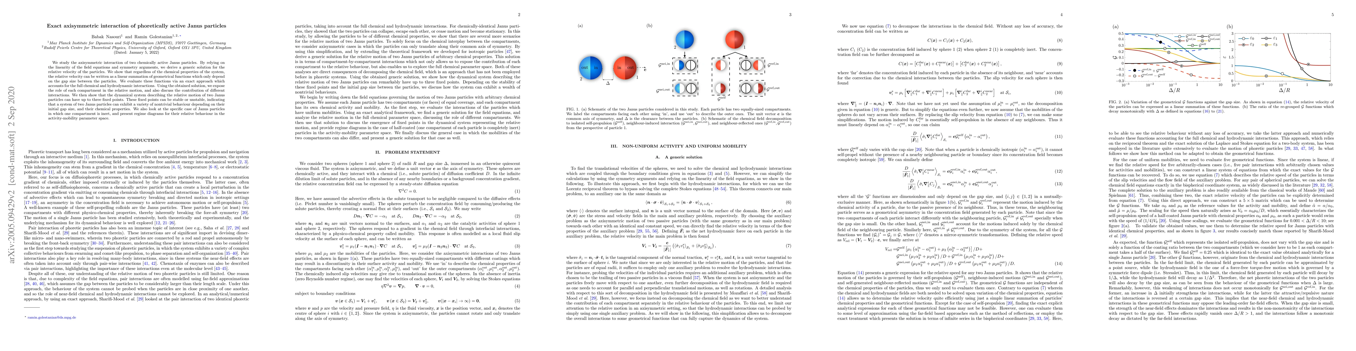 This paper derives a generic solution for the axisymmetric interaction of two chemically active Janus particles, revealing that their relative velocity depends linearly on geometrical functions influenced by the gap size. It explores the dynamic behavior of these particles, identifying up to three fixed points that can be stable or unstable, and discusses the specific case of inert compartments with regime diagrams.