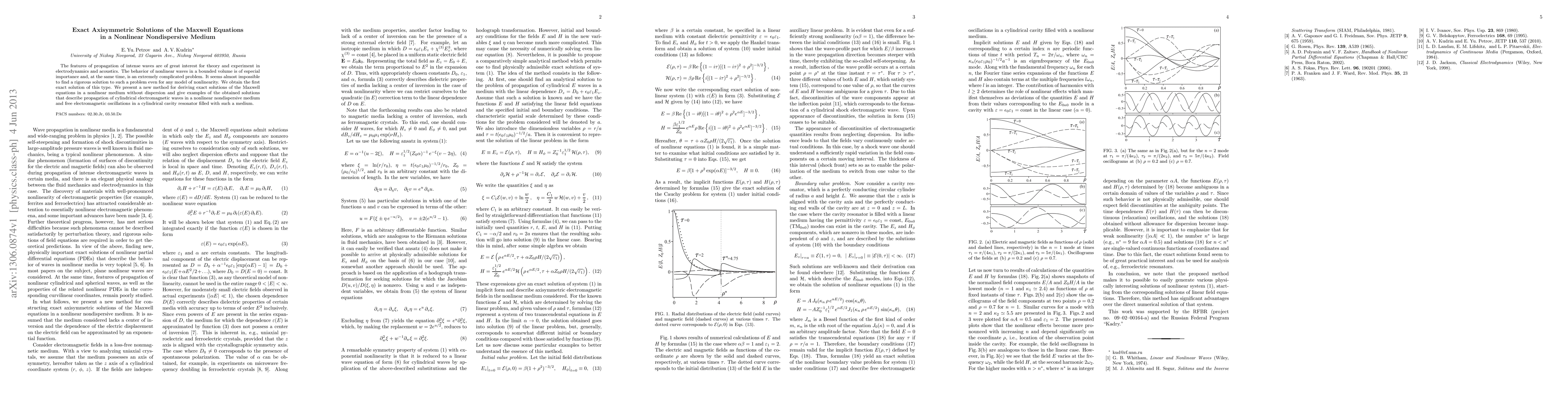 The features of propagation of intense waves are of great interest for theory and experiment in electrodynamics and acoustics. The behavior of nonlinear waves in a bounded volume is of especial importance and, at the same time, is an extremely complicated problem. It seems almost impossible to find a rigorous solution to such a problem even for any model of nonlinearity. We obtain the first exact solution of this type. We present a new method for deriving exact solutions of the Maxwell equations in a nonlinear medium without dispersion and give examples of the obtained solutions that describe propagation of cylindrical electromagnetic waves in a nonlinear nondispersive medium and free electromagnetic oscillations in a cylindrical cavity resonator filled with such a medium.