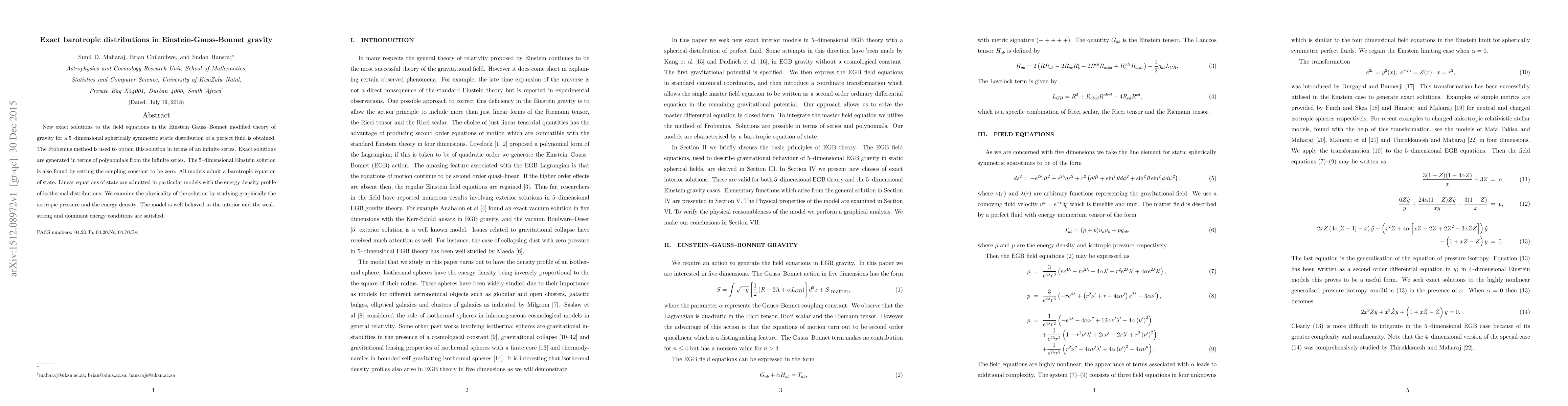 New exact solutions to the field equations in the Einstein--Gauss--Bonnet modified theory of gravity for a 5--dimensional spherically symmetric static distribution of a perfect fluid is obtained. The Frobenius method is used to obtain this solution in terms of an infinite series. Exact solutions are generated in terms of polynomials from the infinite series. The 5--dimensional Einstein solution is also found by setting the coupling constant to be zero. All models admit a barotropic equation of state. Linear equations of state are admitted in particular models with the energy density profile of isothermal distributions. We examine the physicality of the solution by studying graphically the isotropic pressure and the energy density. The model is well behaved in the interior and the weak, strong and dominant energy conditions are satisfied.
