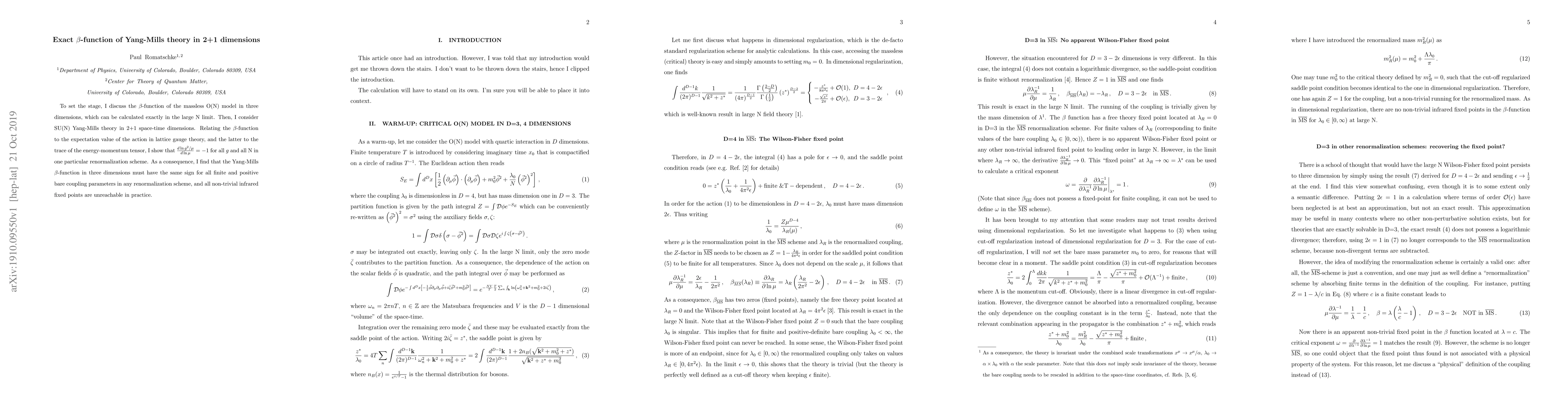 This paper calculates the exact $\beta$-function for SU(N) Yang-Mills theory in 2+1 dimensions, showing that $\frac{d \ln g^2/\mu}{d\ln \mu} = -1$ for all couplings and N, implying all non-trivial infrared fixed points are inaccessible and the $\beta$-function retains the same sign in any renormalization scheme.