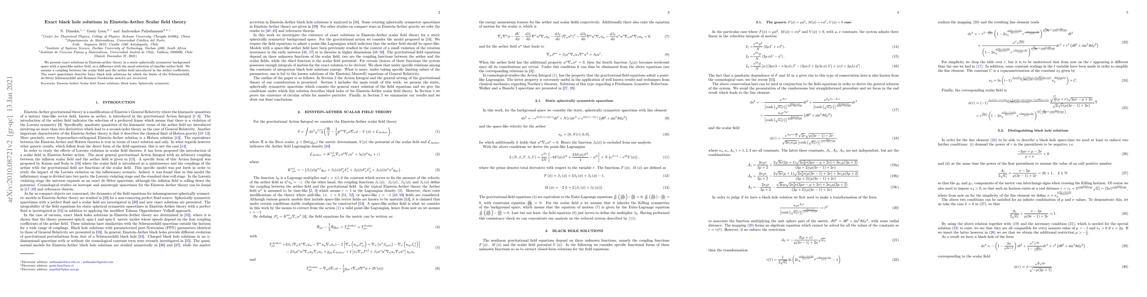 The derivation of exact analytical solutions in Einstein-aether scalar field theory with a spacelike aether field, providing hairy black hole solutions.