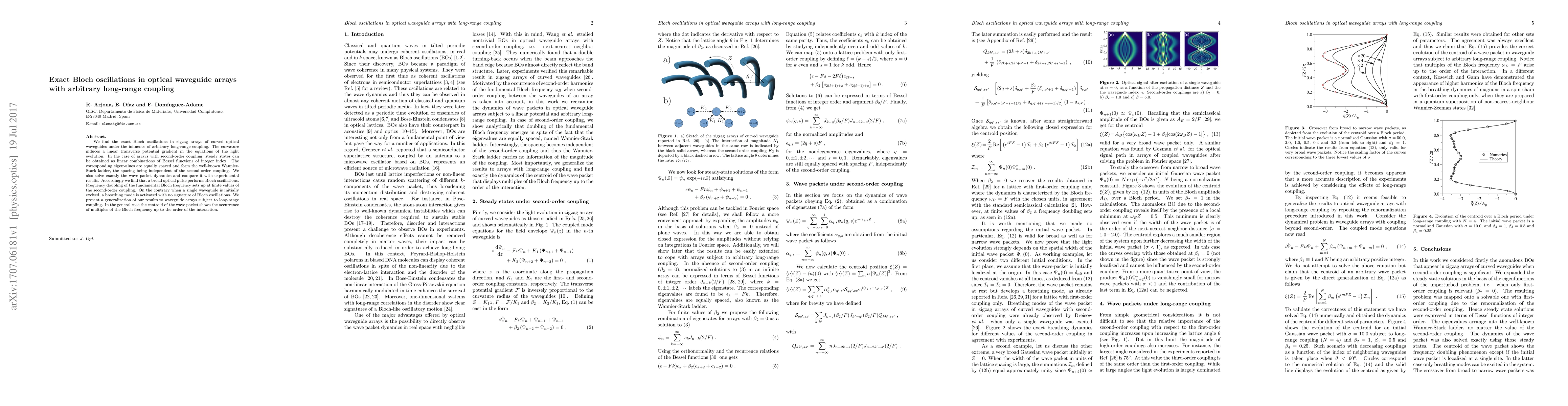 This paper explores exact Bloch oscillations in optical waveguide arrays with long-range coupling, revealing that curvature induces a linear transverse potential gradient. It finds that second-order coupling results in steady states described by Bessel functions, with equally spaced eigenvalues forming the Wannier-Stark ladder, independent of the coupling strength.