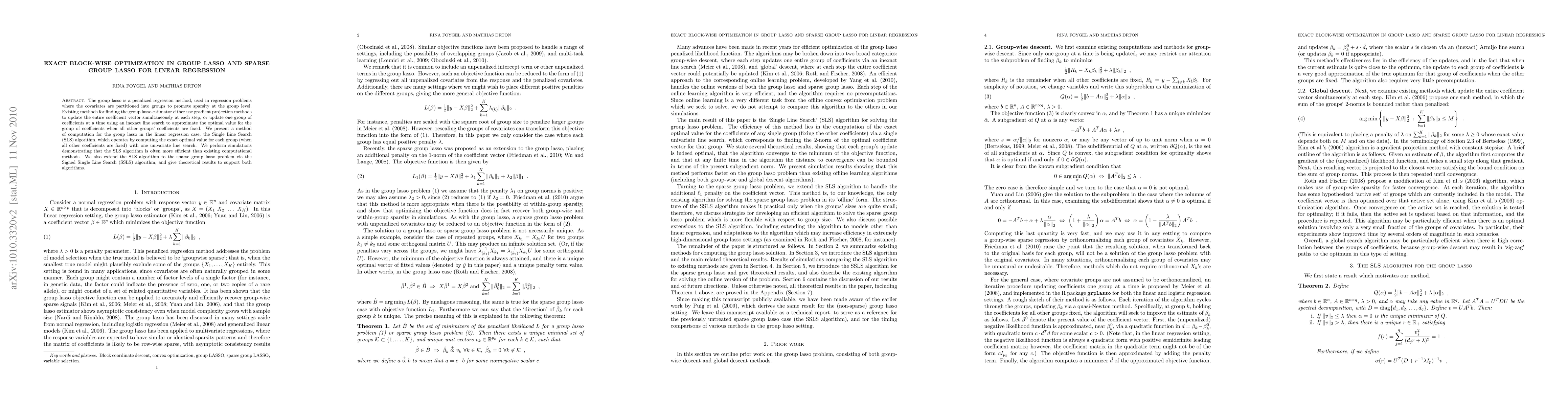 The paper presents the Single Line Search (SLS) algorithm for the group lasso in linear regression, which computes the exact optimal value for each group with one univariate line search, contrasting with existing methods that use gradient projection or approximate line searches.