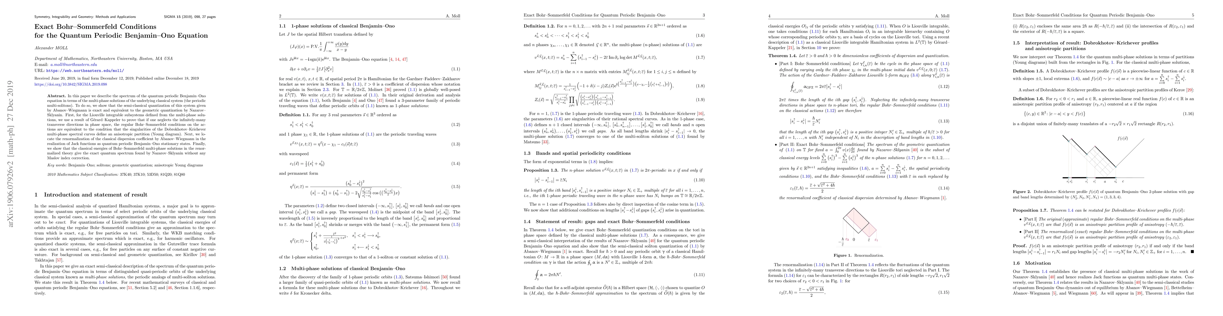 In this paper we describe the spectrum of the quantum periodic Benjamin-Ono equation in terms of the multi-phase solutions of the underlying classical system (the periodic multi-solitons). To do so, we show that the semi-classical quantization of this system given by Abanov-Wiegmann is exact and equivalent to the geometric quantization by Nazarov-Sklyanin. First, for the Liouville integrable subsystems defined from the multi-phase solutions, we use a result of G\'{e}rard-Kappeler to prove that if one neglects the infinitely-many transverse directions in phase space, the regular Bohr-Sommerfeld conditions on the actions are equivalent to the condition that the singularities of the Dobrokhotov-Krichever multi-phase spectral curves define an anisotropic partition (Young diagram). Next, we locate the renormalization of the classical dispersion coefficient by Abanov-Wiegmann in the realization of Jack functions as quantum periodic Benjamin-Ono stationary states. Finally, we show that the classical energies of Bohr-Sommerfeld multi-phase solutions in the renormalized theory give the exact quantum spectrum found by Nazarov-Sklyanin without any Maslov index correction.