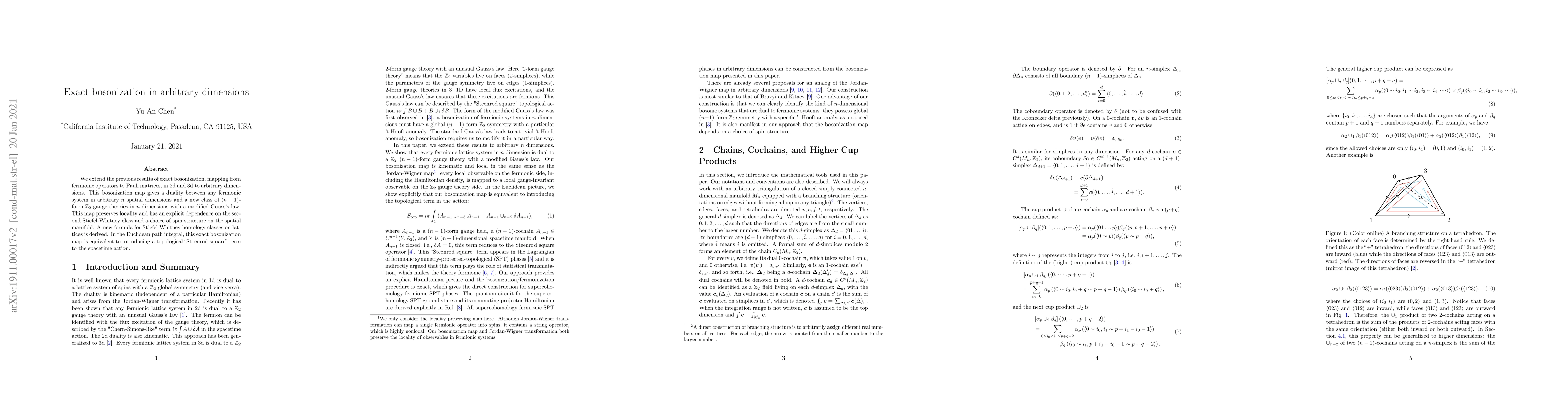 This paper extends exact bosonization from 2d and 3d to arbitrary dimensions, establishing a duality between fermionic systems and $(n-1)$-form $\mathbb{Z}_2$ gauge theories, preserving locality and depending on the second Stiefel-Whitney class and spin structure. It introduces a topological "Steenrod square" term in the Euclidean path integral.
