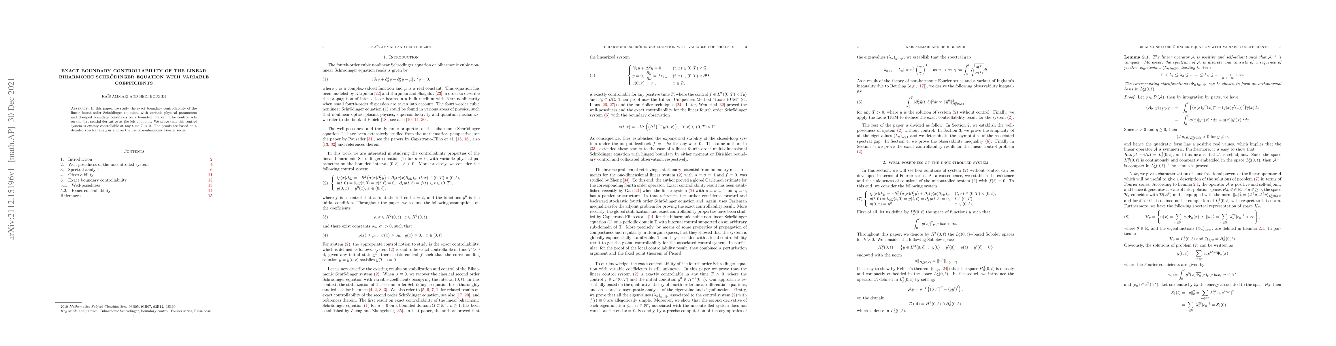 This paper investigates the exact boundary controllability of a linear fourth-order Schrödinger equation with variable coefficients, proving that control acting on the first spatial derivative at the left endpoint can achieve exact controllability at any time $T>0$. The proofs leverage spectral analysis and nonharmonic Fourier series.