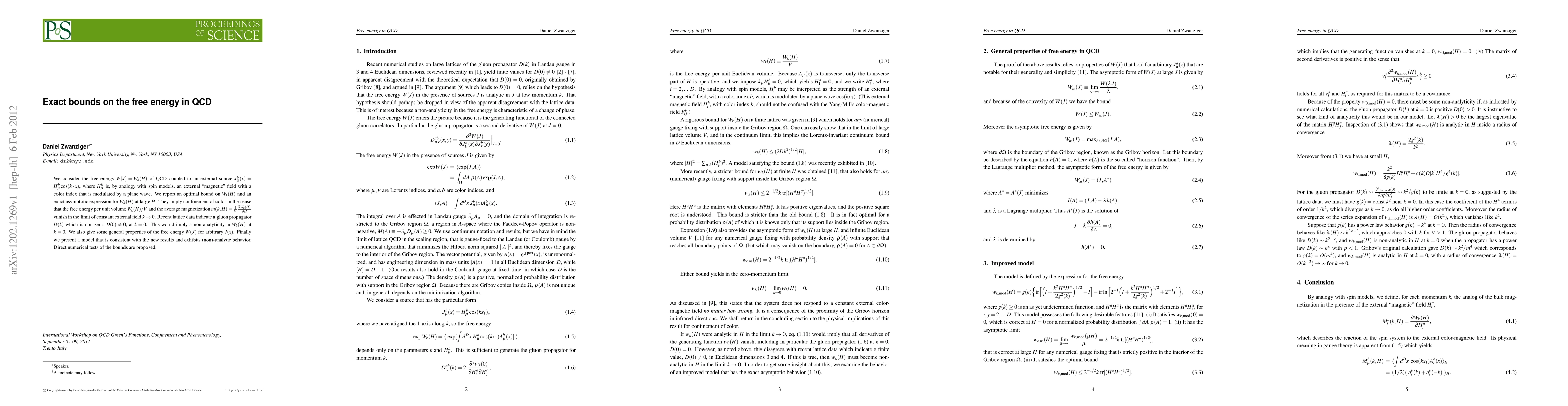 We consider the free energy $W[J] = W_k(H)$ of QCD coupled to an external source $J_\mu^b(x) = H_\mu^b \cos(k \cdot x)$, where $H_\mu^b$ is, by analogy with spin models, an external "magnetic" field with a color index that is modulated by a plane wave. We report an optimal bound on $W_k(H)$ and an exact asymptotic expression for $W_k(H)$ at large $H$. They imply confinement of color in the sense that the free energy per unit volume $W_k(H)/V$ and the average magnetization $m(k, H) ={1 \over V} {\p W_k(H) \over \p H}$ vanish in the limit of constant external field $k \to 0$. Recent lattice data indicate a gluon propagator $D(k)$ which is non-zero, $D(0) \neq 0$, at $k = 0$. This would imply a non-analyticity in $W_k(H)$ at $k = 0$. We also give some general properties of the free energy $W(J)$ for arbitrary $J(x)$. Finally we present a model that is consistent with the new results and exhibits (non)-analytic behavior. Direct numerical tests of the bounds are proposed.