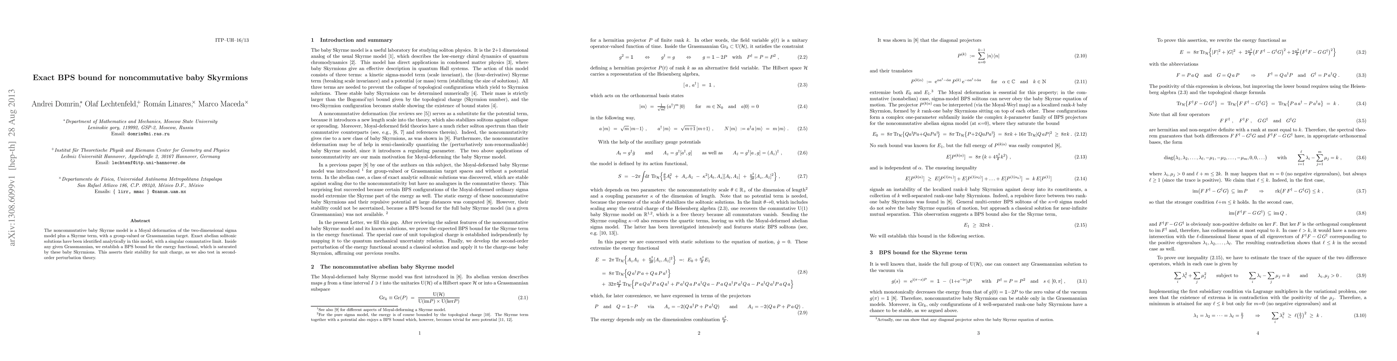 This research identifies exact abelian solitonic solutions in the noncommutative baby Skyrme model, establishing a BPS bound for the energy functional that is satisfied by these solutions, thereby confirming their stability for unit charge under second-order perturbation theory.