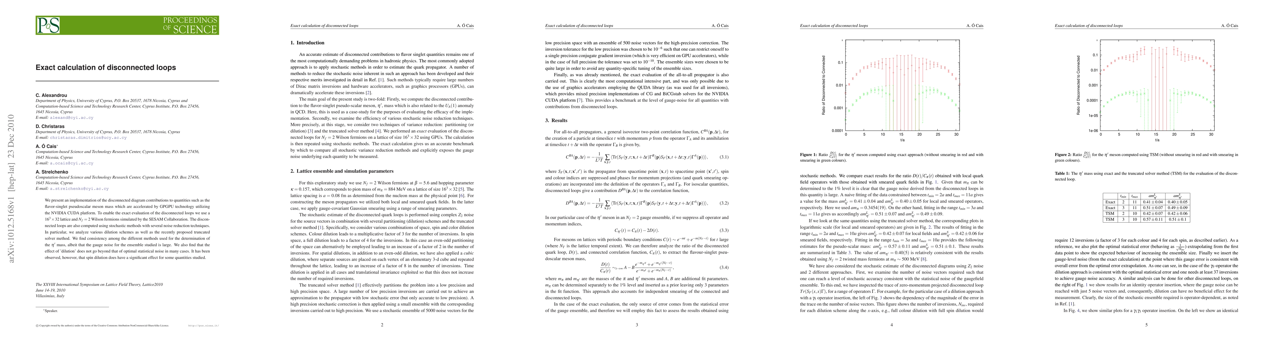 We present an implementation of the disconnected diagram contributions to quantities such as the flavor-singlet pseudoscalar meson mass which are accelerated by GPGPU technology utilizing the NVIDIA CUDA platform. To enable the exact evaluation of the disconnected loops we use a $16^3 \times 32$ lattice and $N_f=2$ Wilson fermions simulated by the SESAM Collaboration. The disconnected loops are also computed using stochastic methods with several noise reduction techniques. In particular, we analyze various dilution schemes as well as the recently proposed truncated s olver method. We find consistency among the different methods used for the determination of the $\eta^\prime$ mass, albeit that the gauge noise for the ensemble studied is large. We also find that the effect of 'dilution' d oes not go beyond that of optimal statistical noise in many cases. It has been observed, however, that spin dilution does have a significant effect for some quantities studied.