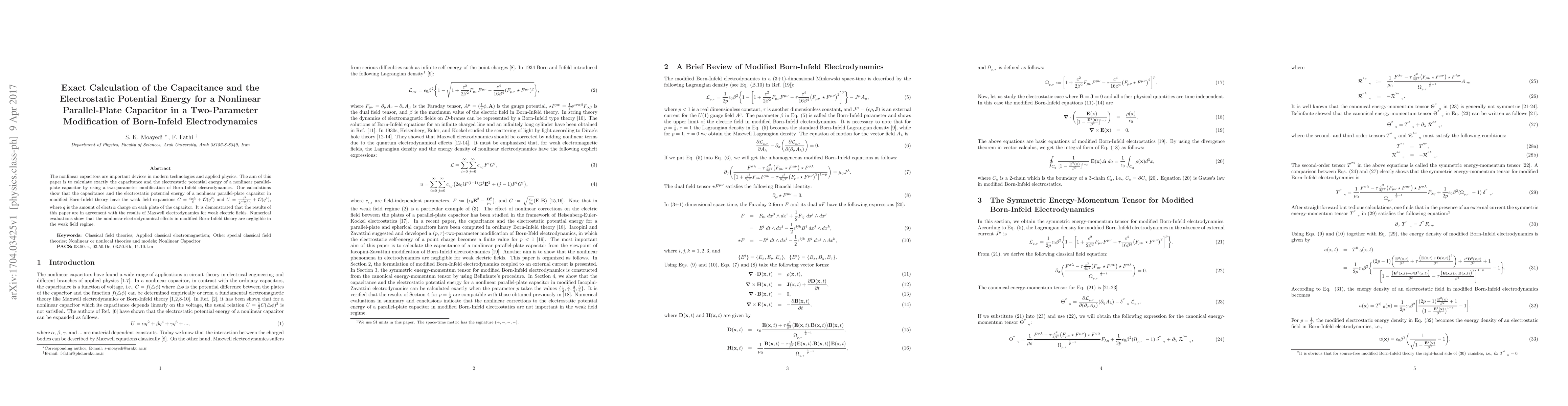 This paper calculates the capacitance and electrostatic potential energy of a nonlinear parallel-plate capacitor using a two-parameter modification of Born-Infeld electrodynamics, showing weak field expansions consistent with Maxwell electrodynamics. The nonlinear effects are negligible in weak fields.