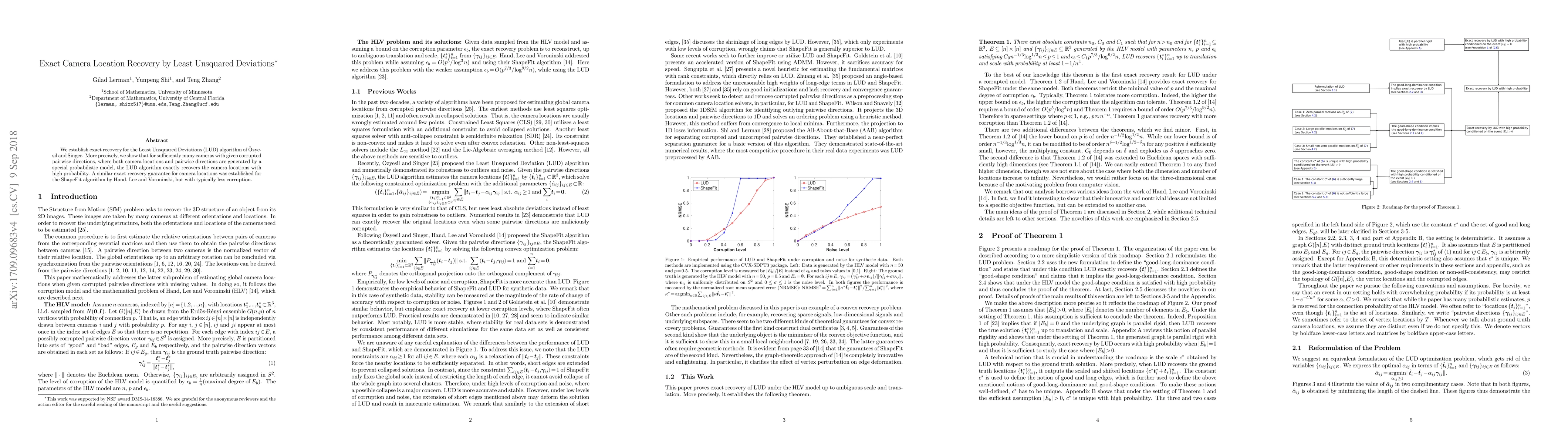 This paper demonstrates that the Least Unsquared Deviations (LUD) algorithm can precisely recover camera locations from corrupted pairwise directions under a probabilistic model, achieving exact recovery with high probability for a sufficiently large number of cameras. This result parallels the exact recovery guarantee for the ShapeFit algorithm but with typically higher levels of corruption.
