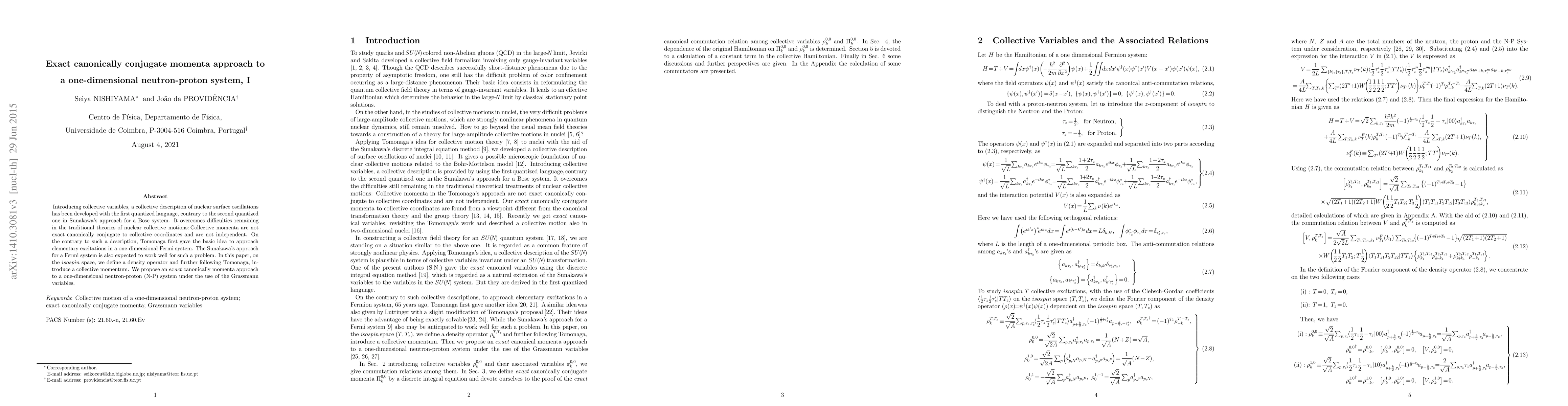 Researchers propose an exact canonically conjugate momenta approach to a one-dimensional neutron-proton system using Grassmann variables, overcoming difficulties in traditional theories of nuclear collective motions.