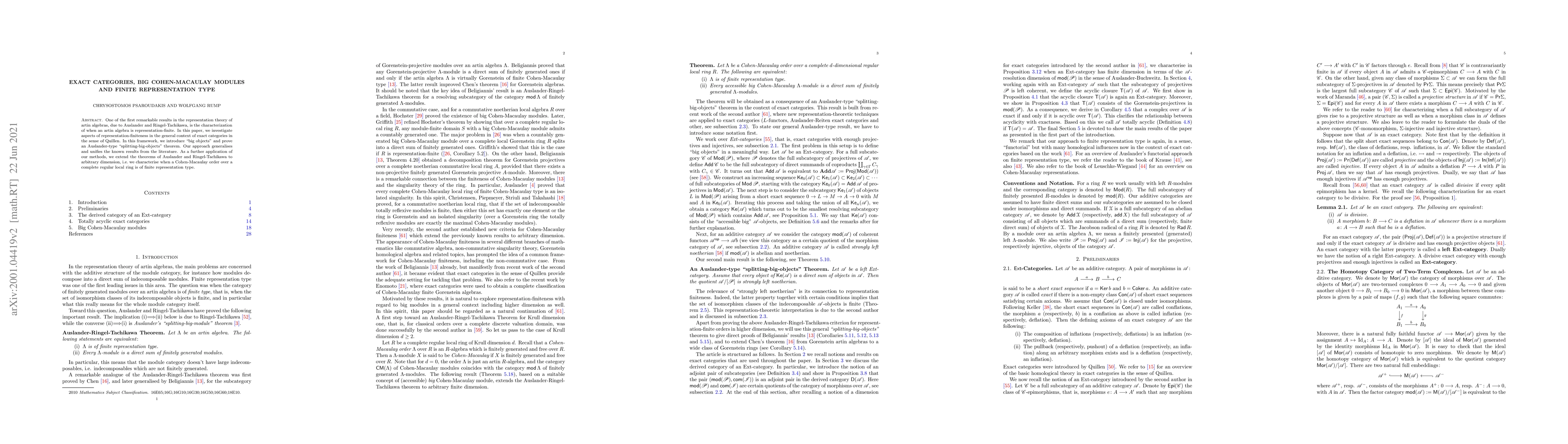 One of the first remarkable results in the representation theory of artin algebras, due to Auslander and Ringel-Tachikawa, is the characterization of when an artin algebra is representation-finite. In this paper, we investigate aspects of representation-finiteness in the general context of exact categories in the sense of Quillen. In this framework, we introduce "big objects" and prove an Auslander-type "splitting-big-objects" theorem. Our approach generalises and unifies the known results from the literature. As a further application of our methods, we extend the theorems of Auslander and Ringel-Tachikawa to arbitrary dimension, i.e. we characterise when a Cohen-Macaulay order over a complete regular local ring is of finite representation type.