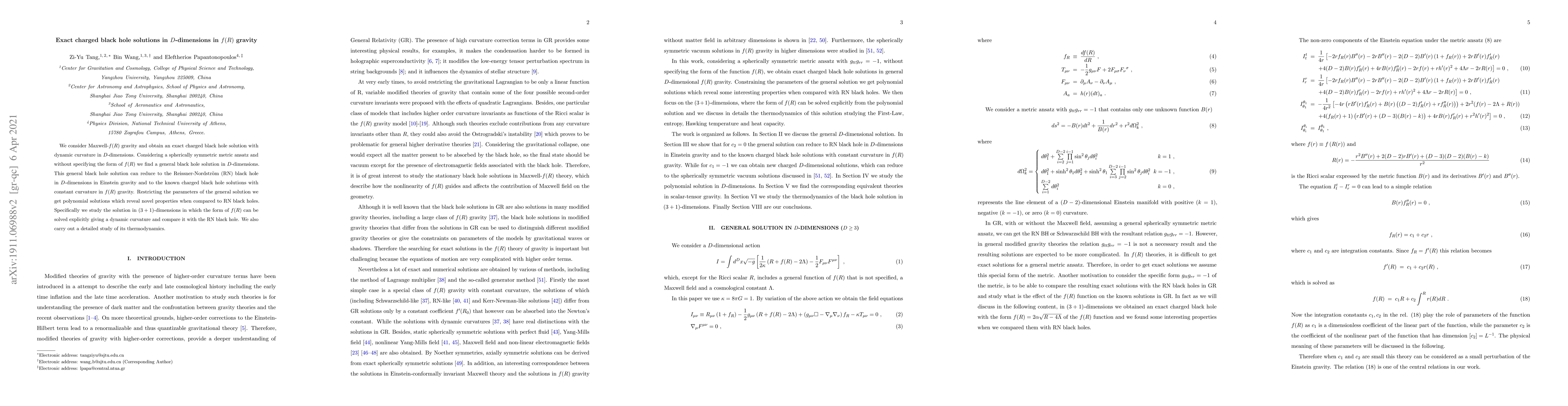 This research paper presents an exact charged black hole solution in D-dimensions within the framework of Maxwell-f(R) gravity, finding a general dynamic curvature solution that reduces to the Reissner-Nordström black hole under certain conditions and exploring its thermodynamic properties. The study highlights novel features of the solution compared to conventional black holes.