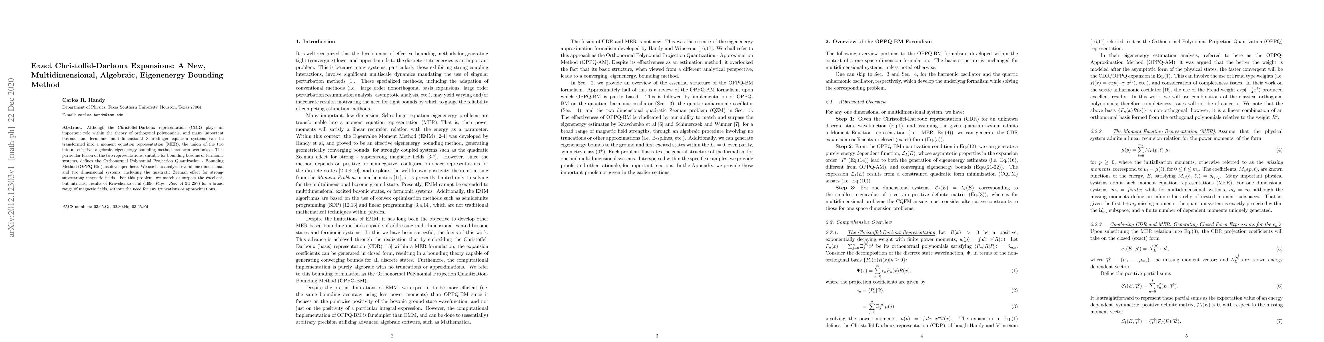 Although the Christoffel-Darboux representation (CDR) plays an important role within the theory of orthogonal polynomials, and many important bosonic and fermionic multidimensional Schrodinger equation systems can be transformed into a moment equation representation (MER), the union of the two into an effective, algebraic, eigenenergy bounding method has been overlooked. This particular fusion of the two representations, suitable for bounding bosonic or fermionic systems, defines the Orthonormal Polynomial Projection Quantization - Bounding Method (OPPQ-BM), as developed here. We use it to analyze several one dimensional and two dimensional systems, including the quadratic Zeeman effect for strong-superstrong magnetic fields. For this problem, we match or surpass the excellent, but intricate, results of Kravchenko et al (1996 Phys. Rev. A 54287) for a broad range of magnetic fields, without the need for any truncations or approximations.