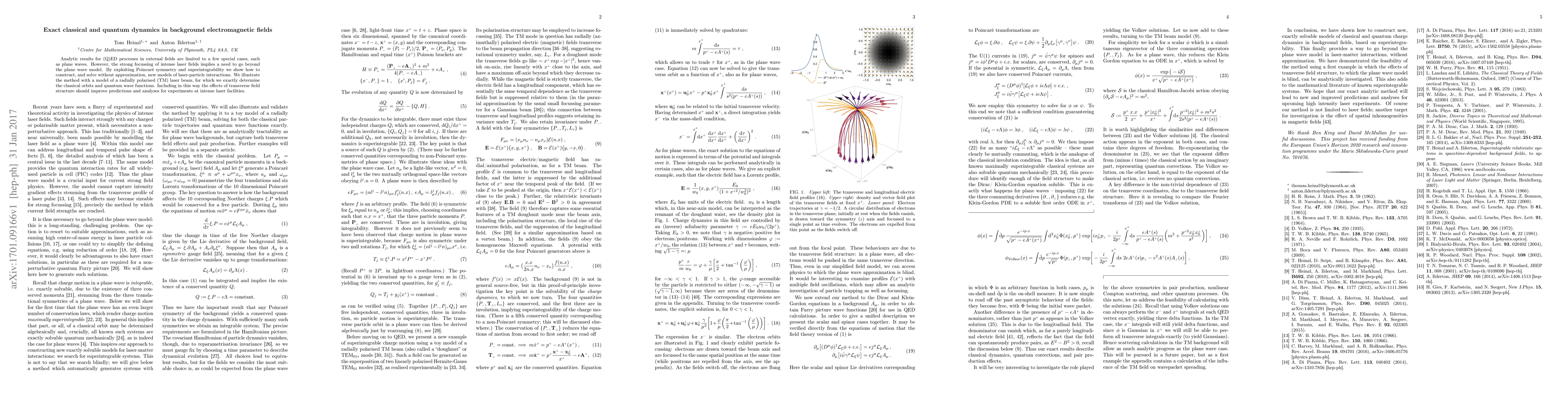 Analytic results for (Q)ED processes in external fields are limited to a few special cases, such as plane waves. However, the strong focussing of intense laser fields implies a need to go beyond the plane wave model. By exploiting Poincar\'e symmetry and superintegrability we show how to construct, and solve without approximation, new models of laser-particle interactions. We illustrate the method with a model of a radially polarised (TM) laser beam, for which we exactly determine the classical orbits and quantum wave functions. Including in this way the effects of transverse field structure should improve predictions and analyses for experiments at intense laser facilities.