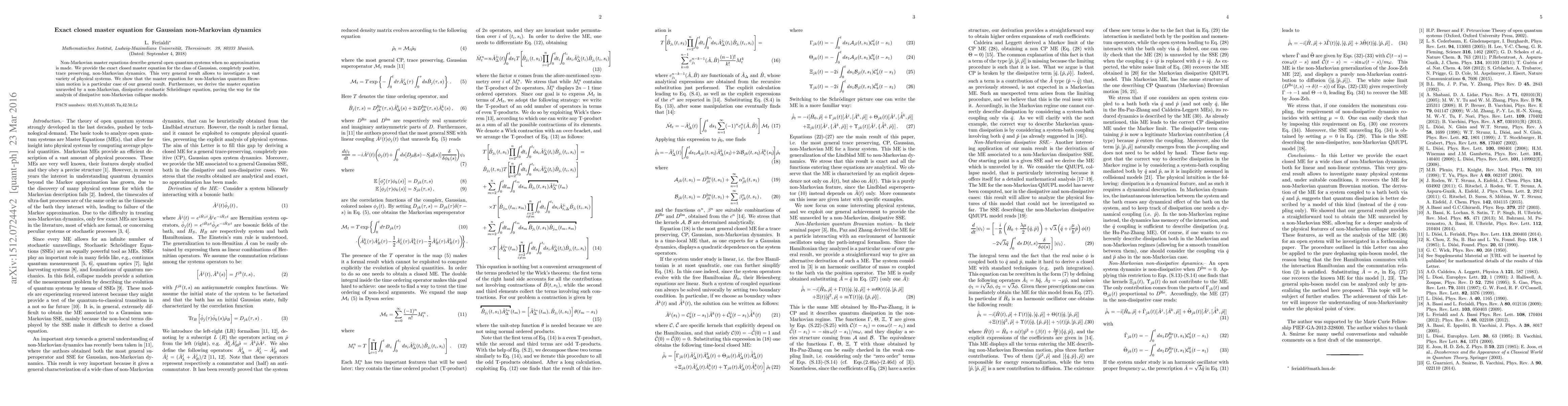 This paper presents an exact closed master equation for Gaussian non-Markovian dynamics in open quantum systems. It generalizes the approach to various physical systems and highlights the applicability to non-Markovian quantum Brownian motion, along with the derivation of a related stochastic Schrödinger equation.