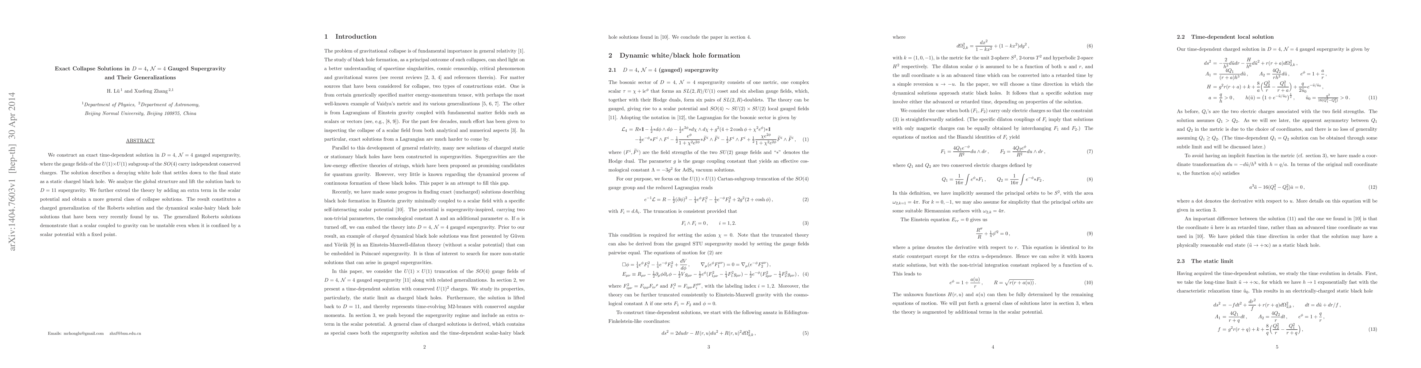 We construct an exact time-dependent solution in $D=4$, ${\cal N}=4$ gauged supergravity, where the gauge fields of the $U(1)\times U(1)$ subgroup of the $SO(4)$ carry independent conserved charges. The solution describes a decaying white hole that settles down to the final state as a static charged black hole. We analyze the global structure and lift the solution back to $D=11$ supergravity. We further extend the theory by adding an extra term in the scalar potential and obtain a more general class of collapse solutions. The result constitutes a charged generalization of the Roberts solution and the dynamical scalar-hairy black hole solutions that have been very recently found by us. The generalized Roberts solutions demonstrate that a scalar coupled to gravity can be unstable even when it is confined by a scalar potential with a fixed point.