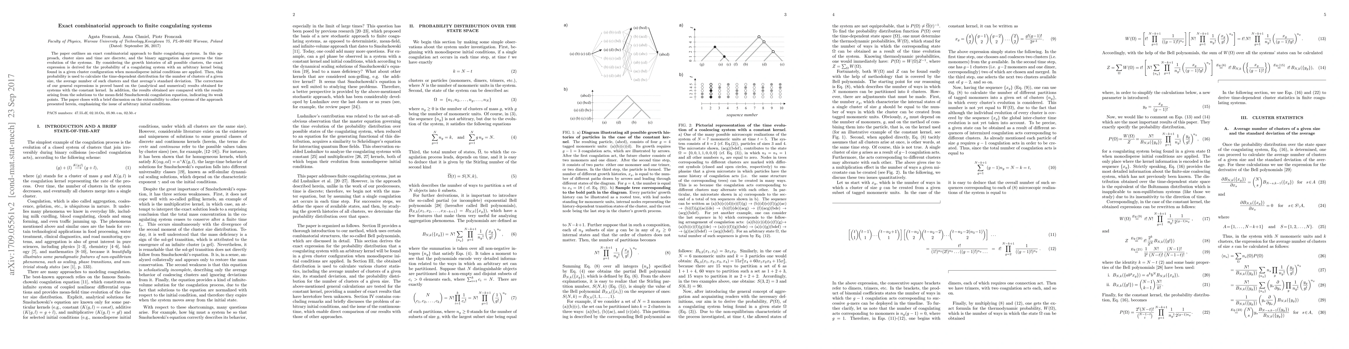 The paper outlines an exact combinatorial approach to finite coagulating systems. In this approach, cluster sizes and time are discrete, and the binary aggregation alone governs the time evolution of the systems. By considering the growth histories of all possible clusters, the exact expression is derived for the probability of a coagulating system with an arbitrary kernel being found in a given cluster configuration when monodisperse initial conditions are applied. Then, this probability is used to calculate the time-dependent distribution for the number of clusters of a given size, the average number of such clusters and that average's standard deviation. The correctness of our general expressions is proved based on the (analytical and numerical) results obtained for systems with the constant kernel. In addition, the results obtained are compared with the results arising from the solutions to the mean-field Smoluchowski coagulation equation, indicating its weak points. The paper closes with a brief discussion on the extensibility to other systems of the approach presented herein, emphasizing the issue of arbitrary initial conditions.