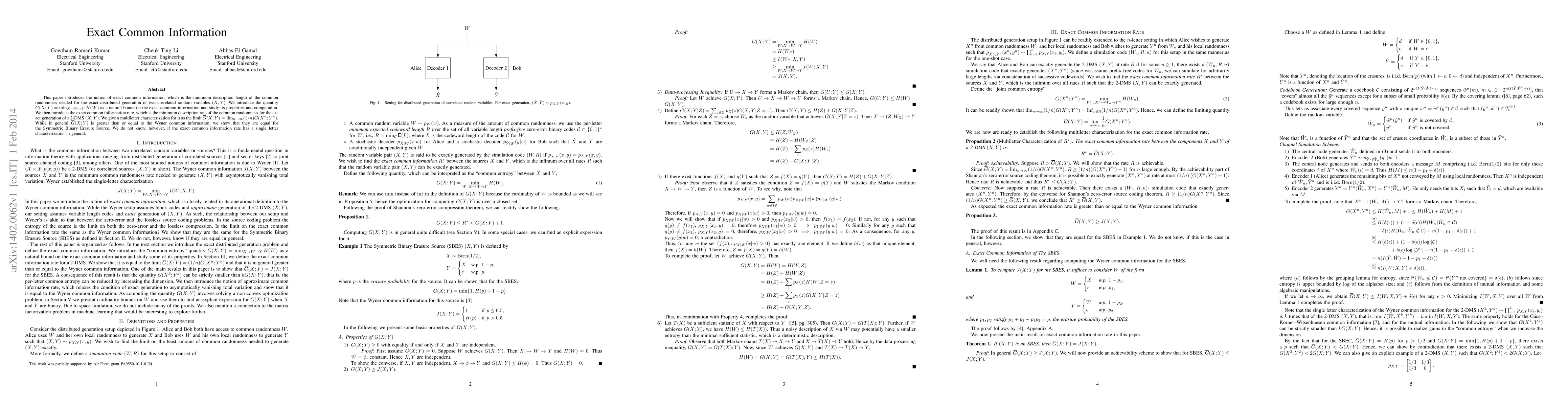 This paper introduces a new concept called exact common information, which measures the minimum description length of shared randomness needed for generating two correlated random variables. It also explores its properties and finds equalities with known concepts like Wyner common information in specific cases.