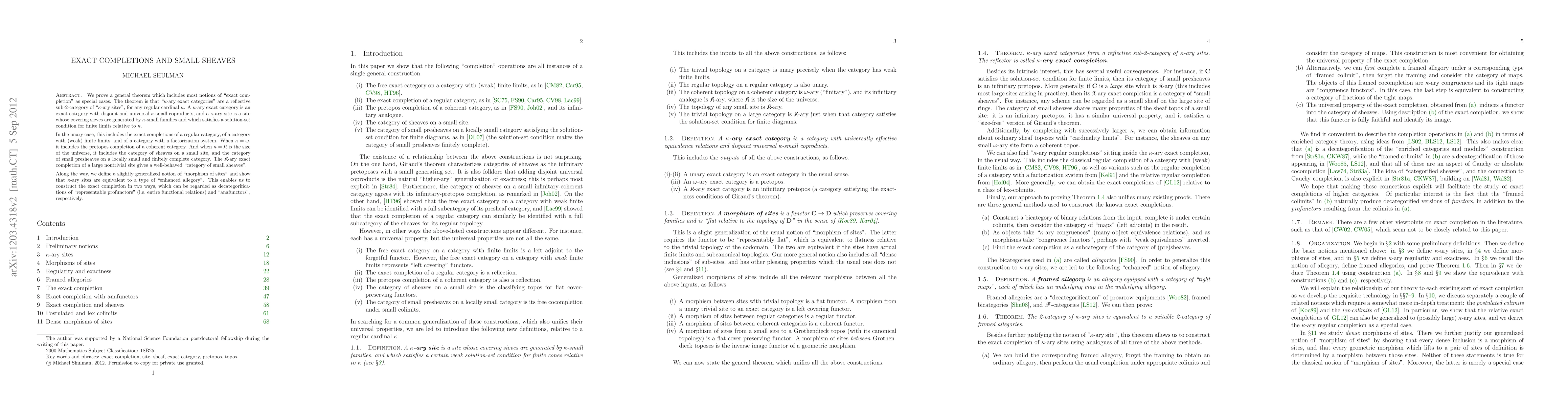 We prove a general theorem which includes most notions of "exact completion". The theorem is that "k-ary exact categories" are a reflective sub-2-category of "k-ary sites", for any regular cardinal k. A k-ary exact category is an exact category with disjoint and universal k-small coproducts, and a k-ary site is a site whose covering sieves are generated by k-small families and which satisfies a weak size condition. For different values of k, this includes the exact completions of a regular category or a category with (weak) finite limits; the pretopos completion of a coherent category; and the category of sheaves on a small site. For a large site with k the size of the universe, it gives a well-behaved "category of small sheaves". Along the way, we define a slightly generalized notion of "morphism of sites", and show that k-ary sites are equivalent to a type of "enhanced allegory".