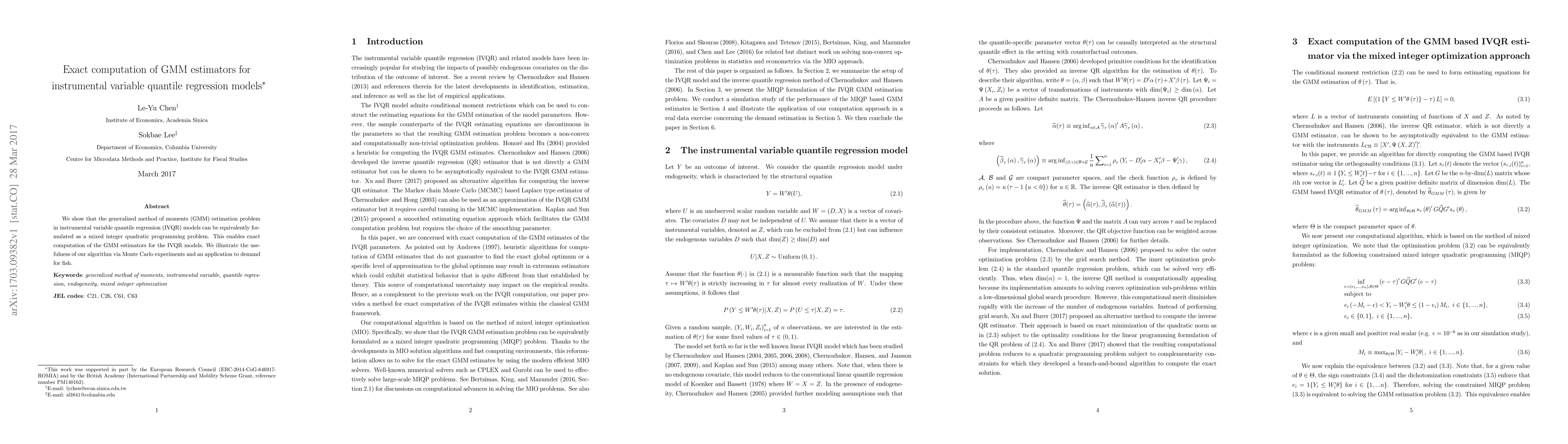 This paper demonstrates that GMM estimators in instrumental variable quantile regression models can be computed exactly by reformulating the estimation problem as a mixed integer quadratic programming problem. The proposed algorithm is validated through Monte Carlo simulations and an application to fish demand analysis.