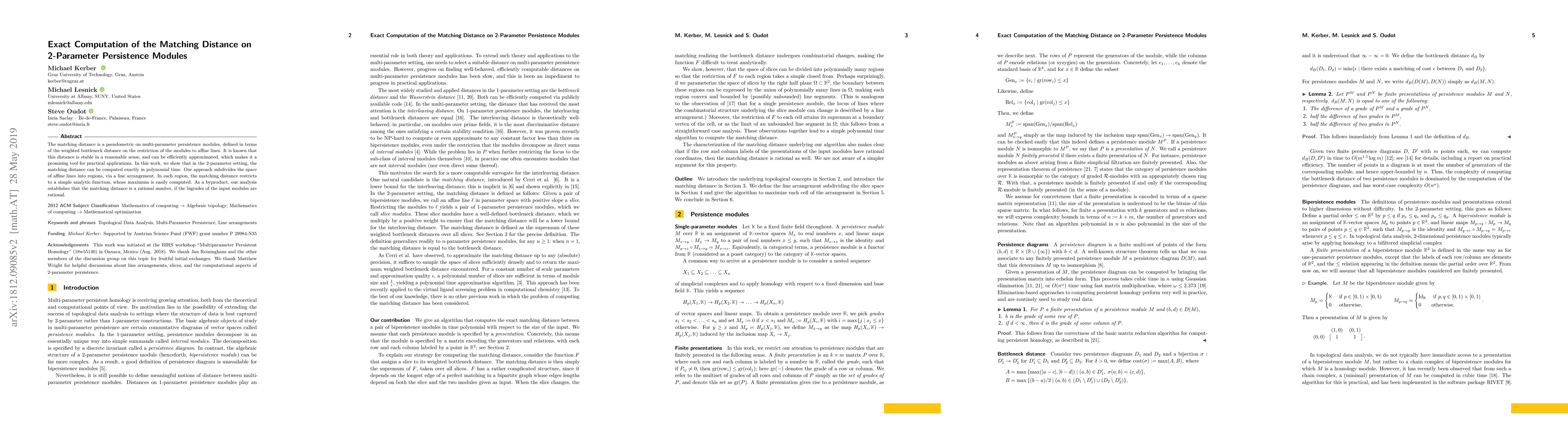 This paper demonstrates that the matching distance in 2-parameter persistence modules can be computed exactly in polynomial time by subdividing the space of affine lines into regions and analyzing the distance as a simple analytic function in each region. Additionally, it proves that the distance is rational when the input modules have rational bigrade values.