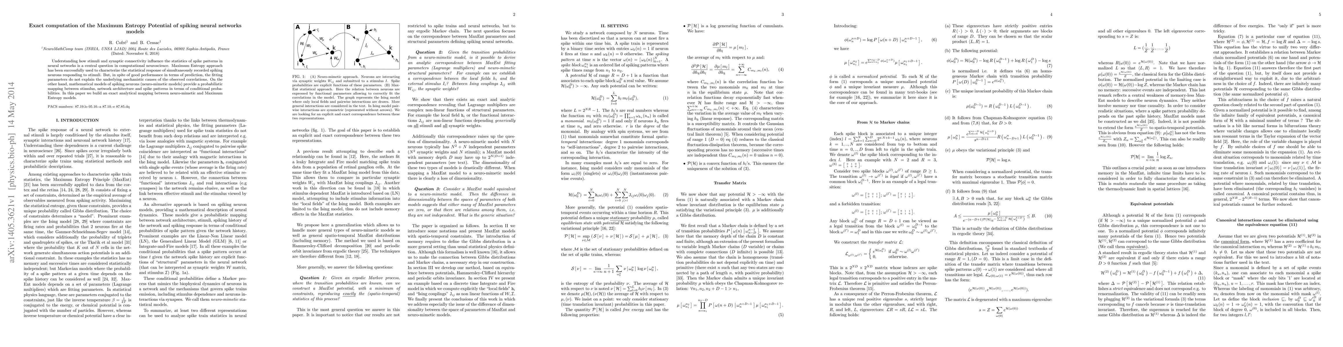 Understanding how stimuli and synaptic connectivity in uence the statistics of spike patterns in neural networks is a central question in computational neuroscience. Maximum Entropy approach has been successfully used to characterize the statistical response of simultaneously recorded spiking neurons responding to stimuli. But, in spite of good performance in terms of prediction, the fitting parameters do not explain the underlying mechanistic causes of the observed correlations. On the other hand, mathematical models of spiking neurons (neuro-mimetic models) provide a probabilistic mapping between stimulus, network architecture and spike patterns in terms of conditional proba- bilities. In this paper we build an exact analytical mapping between neuro-mimetic and Maximum Entropy models.