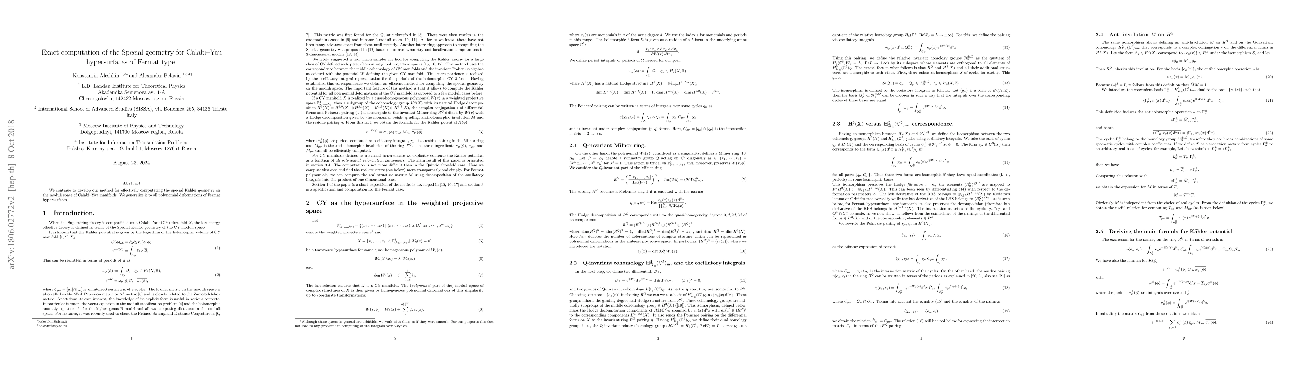 Summary: This paper develops a method for computing the special Kähler geometry on the moduli space of Calabi-Yau manifolds, specifically focusing on the polynomial deformations of Fermat hypersurfaces. The authors generalize their approach to handle these computations exactly.